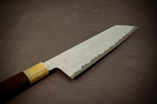 Gyuto: A general-purpose knife that most chefs would say they could not do without. This knife is the Japanese knife makers answer to the western chef knife. Gyuto translates to cow blade. They are generally tall at the heel, flat throughout, and rounded toward the tip of the knife for rock chopping. We use our gyuto for just about anything, from butchering certain fish, to brunoise veg, to cutting the cake. Any good chef will tell you to buy a quality Gyuto first, and build the the rest of your knife kit around it.