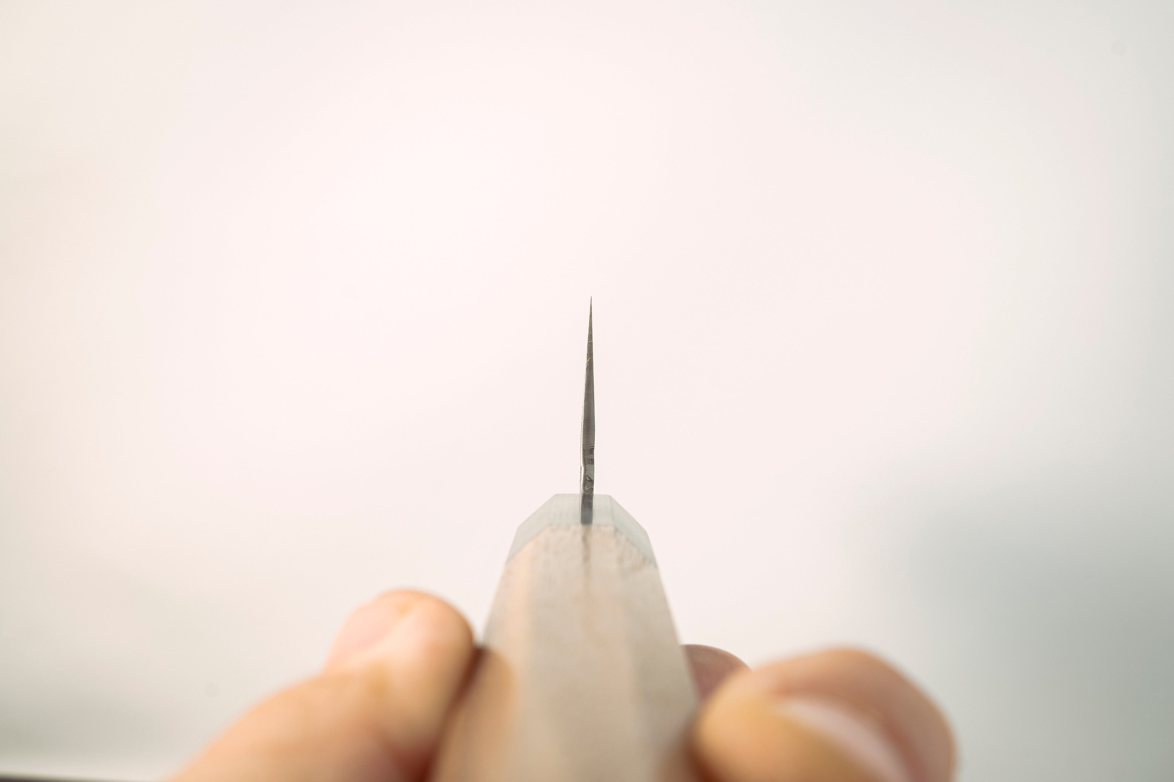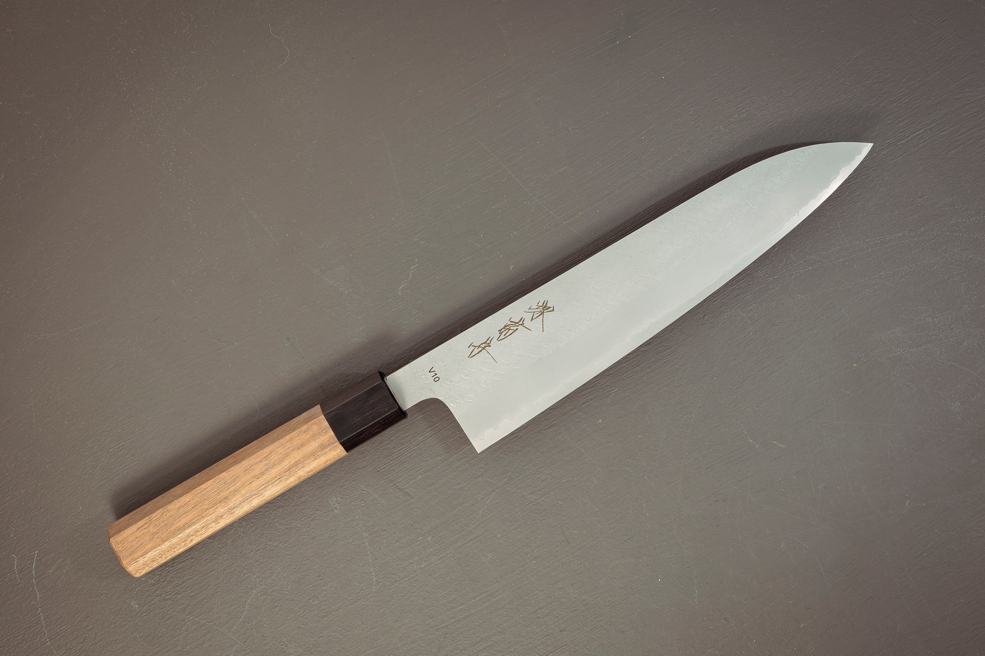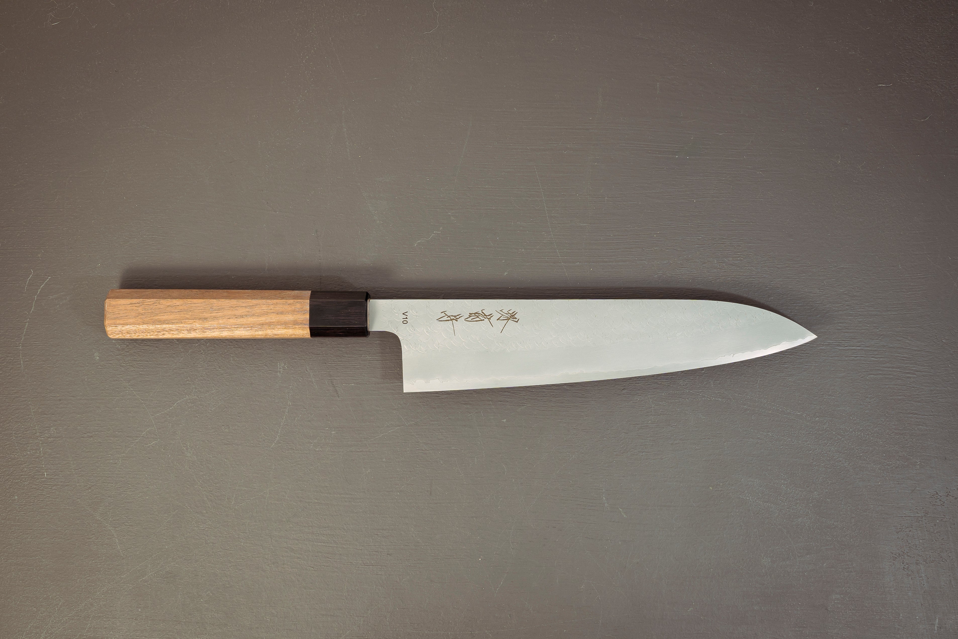 Gyuto: A general-purpose knife that most chefs would say they could not do without. This knife is the Japanese knife makers answer to the western “chef knife”. Gyuto translates to “cow blade”. They are generally tall at the heel, flat throughout, and rounded toward the tip of the knife for rock chopping. I use my gyuto for just about anything, from butchering fish, to brunoise veg, to cutting the cake. Any good chef will tell you to buy a quality Gyuto first, and build the the rest of your knife kit around it.