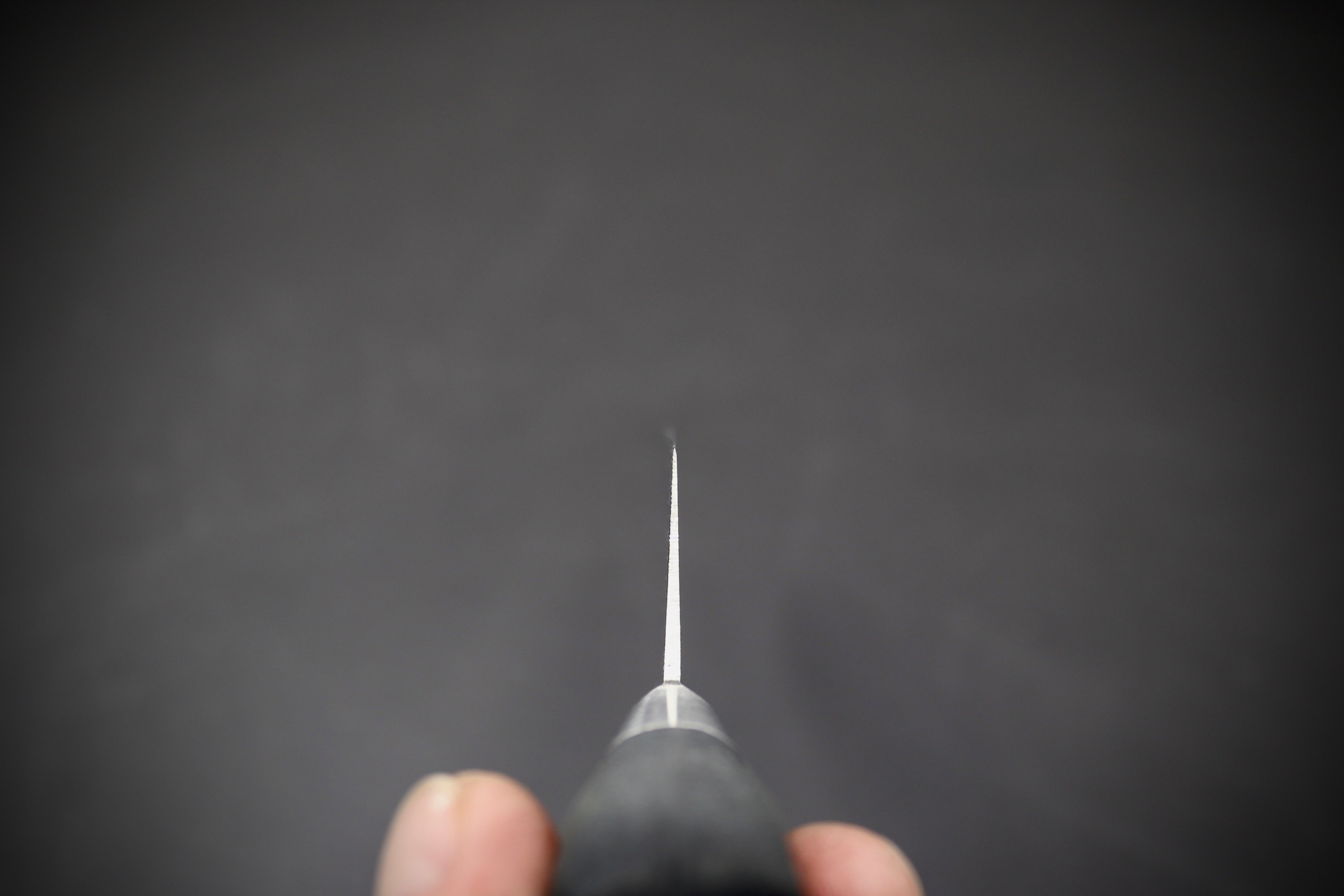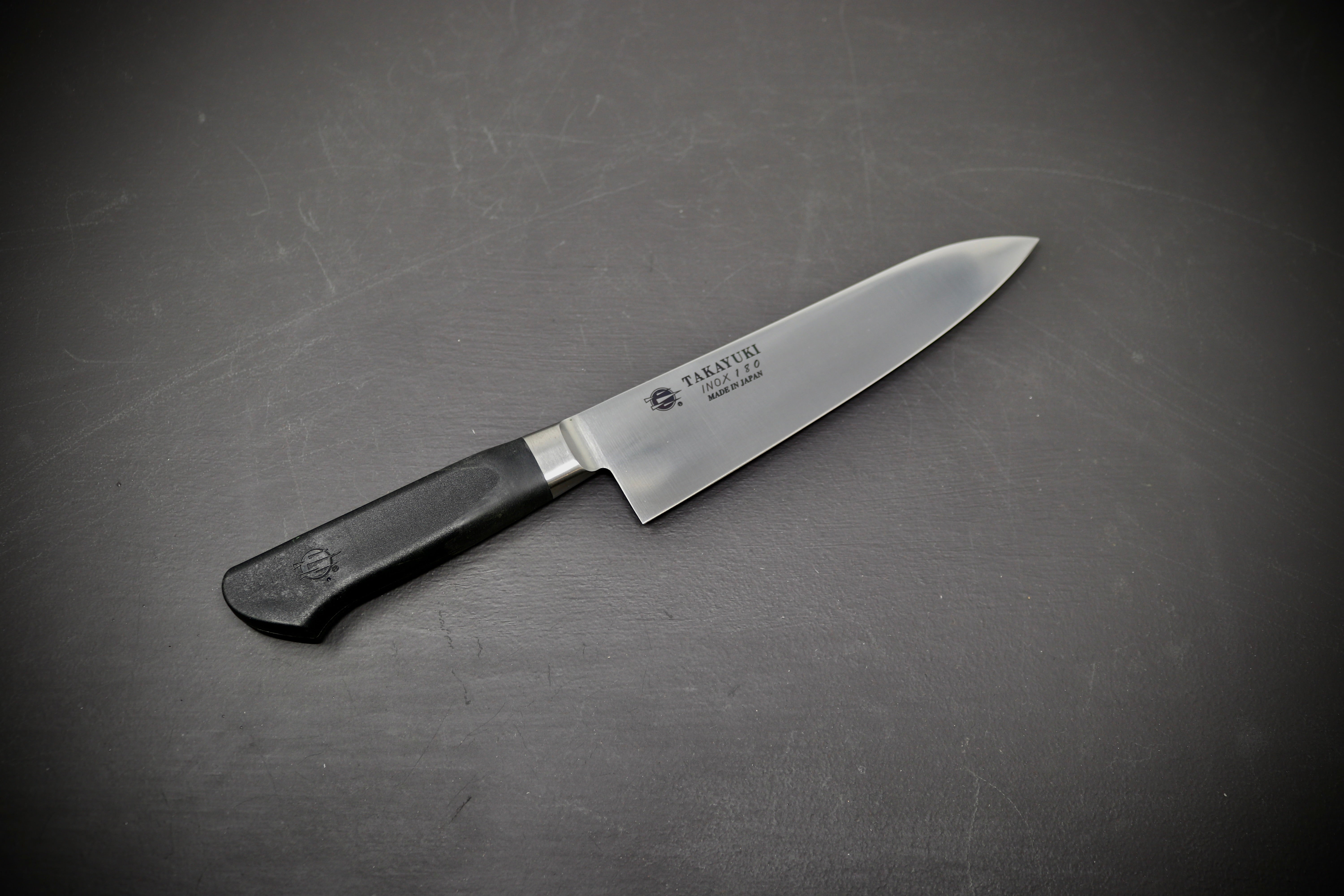 Gyuto: A general-purpose knife that most chefs would say they could not do without. This knife is the Japanese knife makers answer to the western “chef knife”. Gyuto translates to “cow blade”. They are generally tall at the heel, flat throughout, and rounded toward the tip of the knife for rock chopping. I use my gyuto for just about anything, from butchering fish, to brunoise veg, to cutting the cake. Any good chef will tell you to buy a quality Gyuto first, and build the the rest of your knife kit around it.