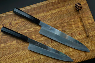 The blue #2 migaki knives have a tall heel height and a stunning kasumi finish. Blue #2 is like Blue #1 but a little softer and tougher, placing it at around 62~63 on the rockwell scale.
