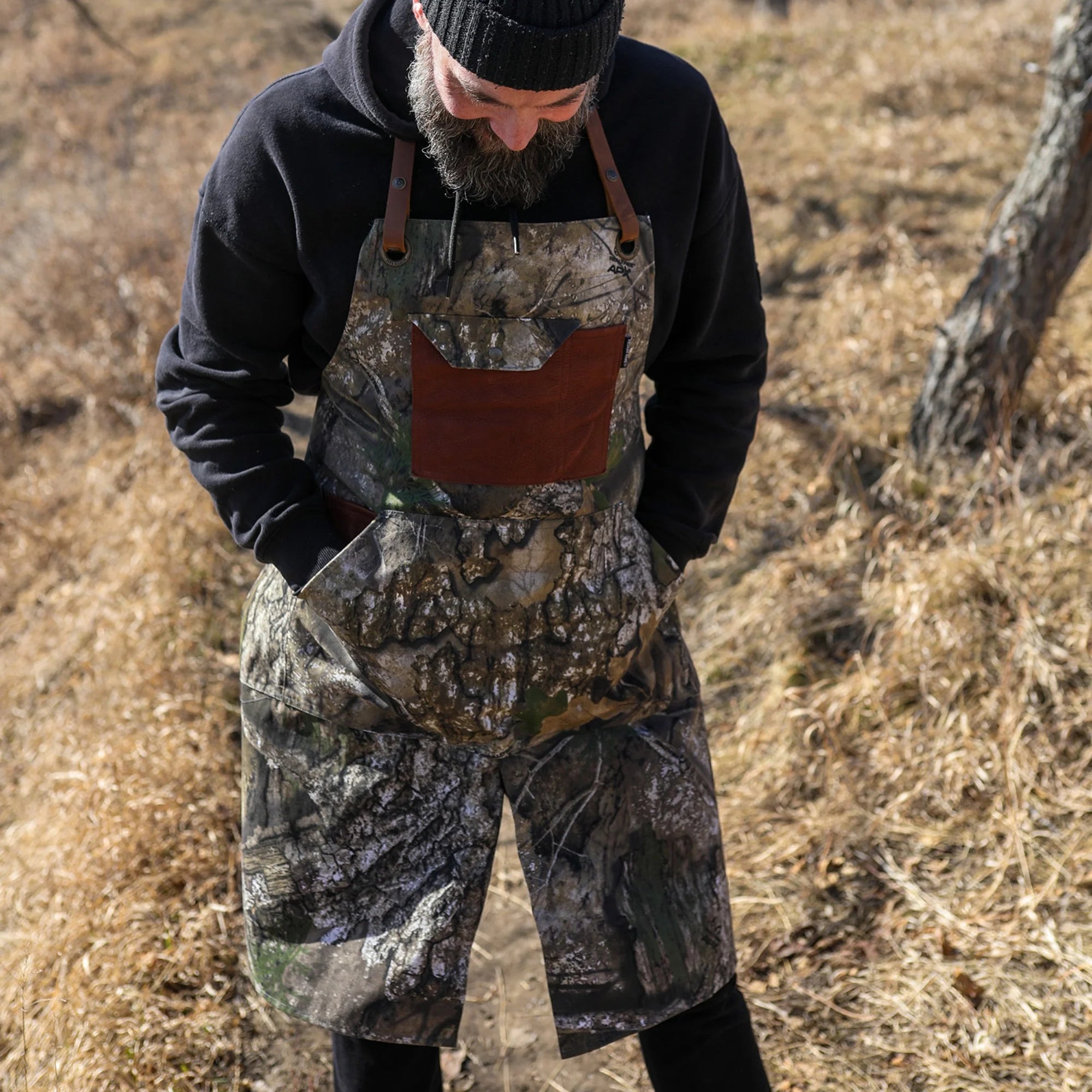This bib-style apron comes with a long list of quality features including genuine leather chest and cell phone pockets. The vented hem makes for improved mobility, and the comfortable light-weight material makes it easy to move around.