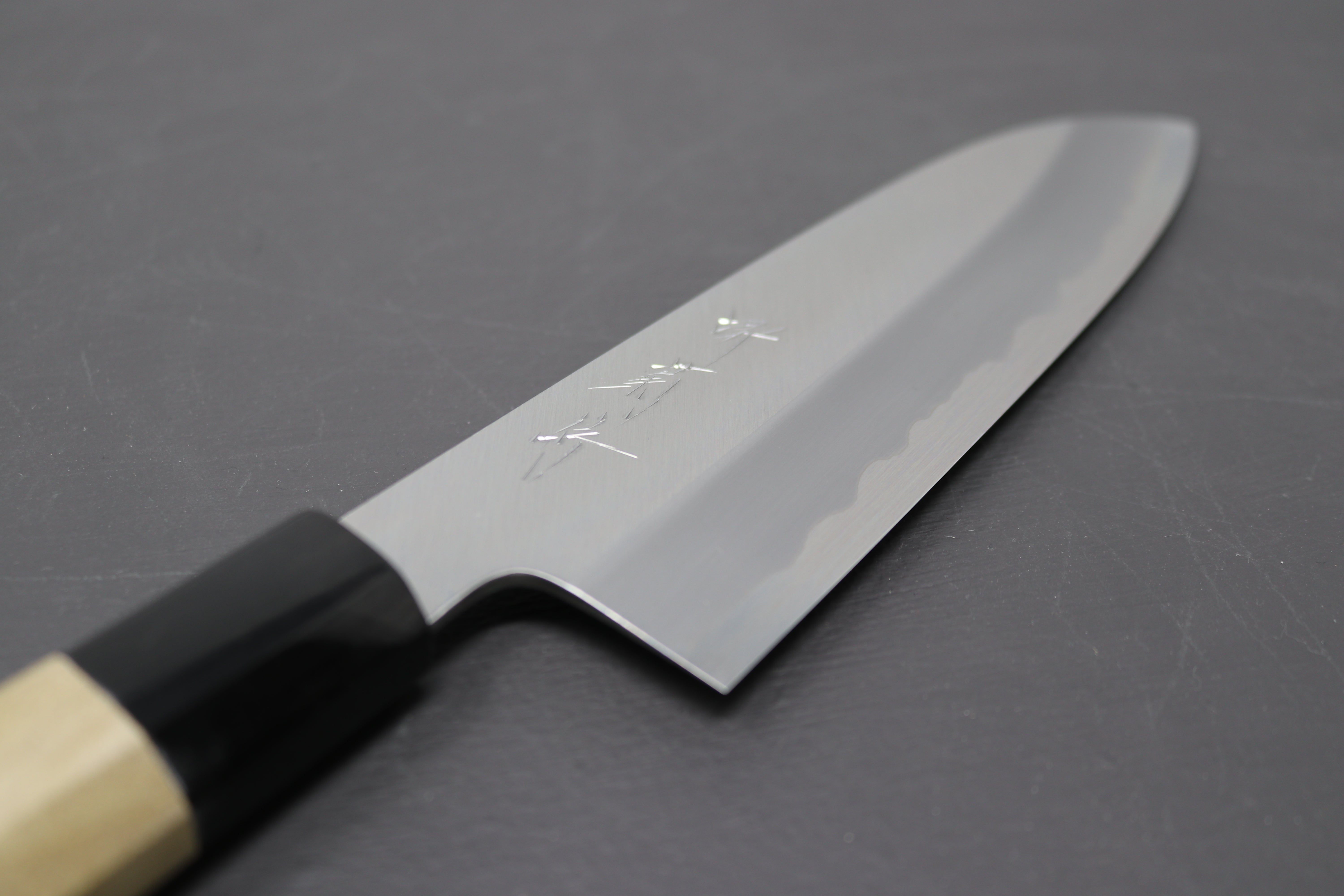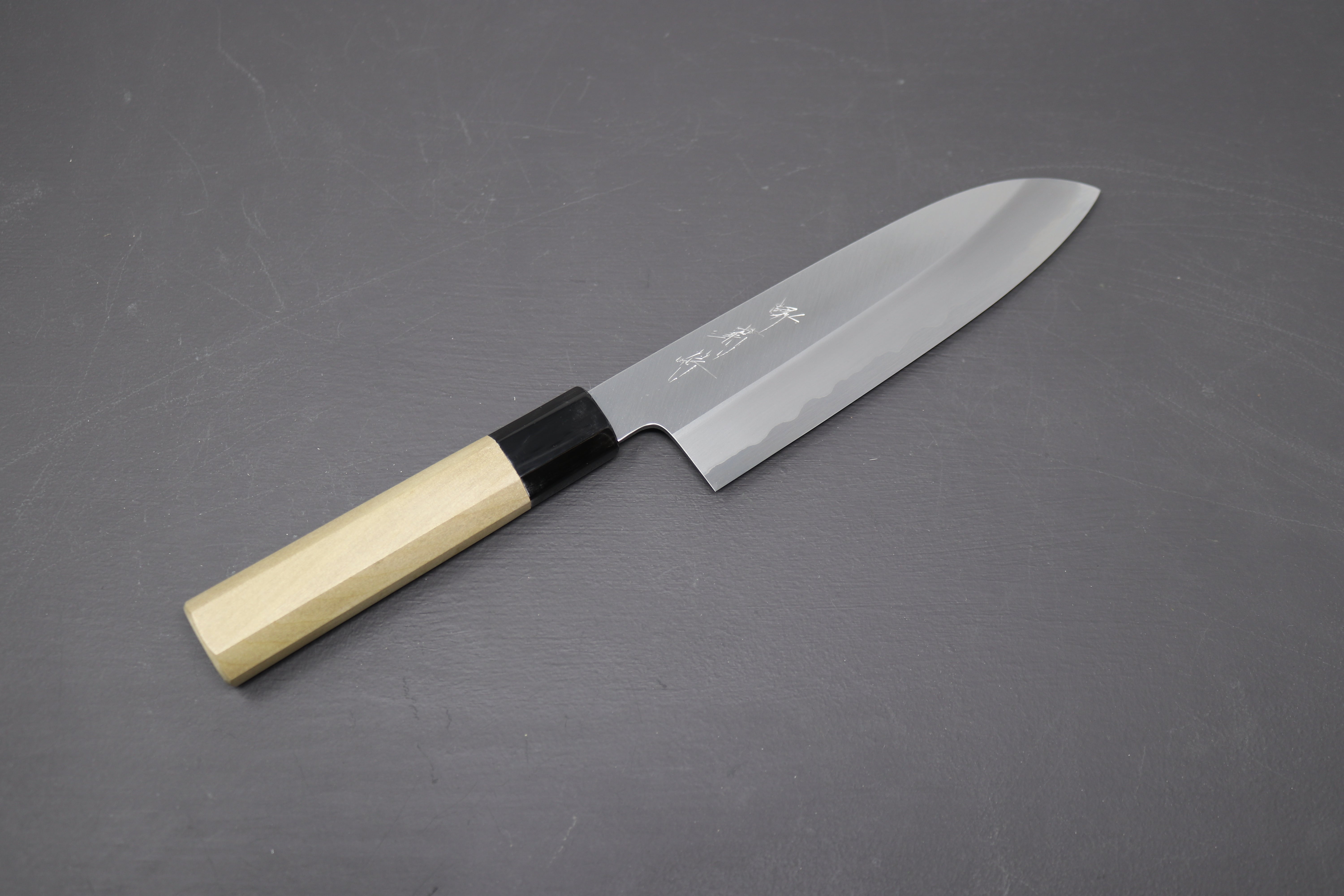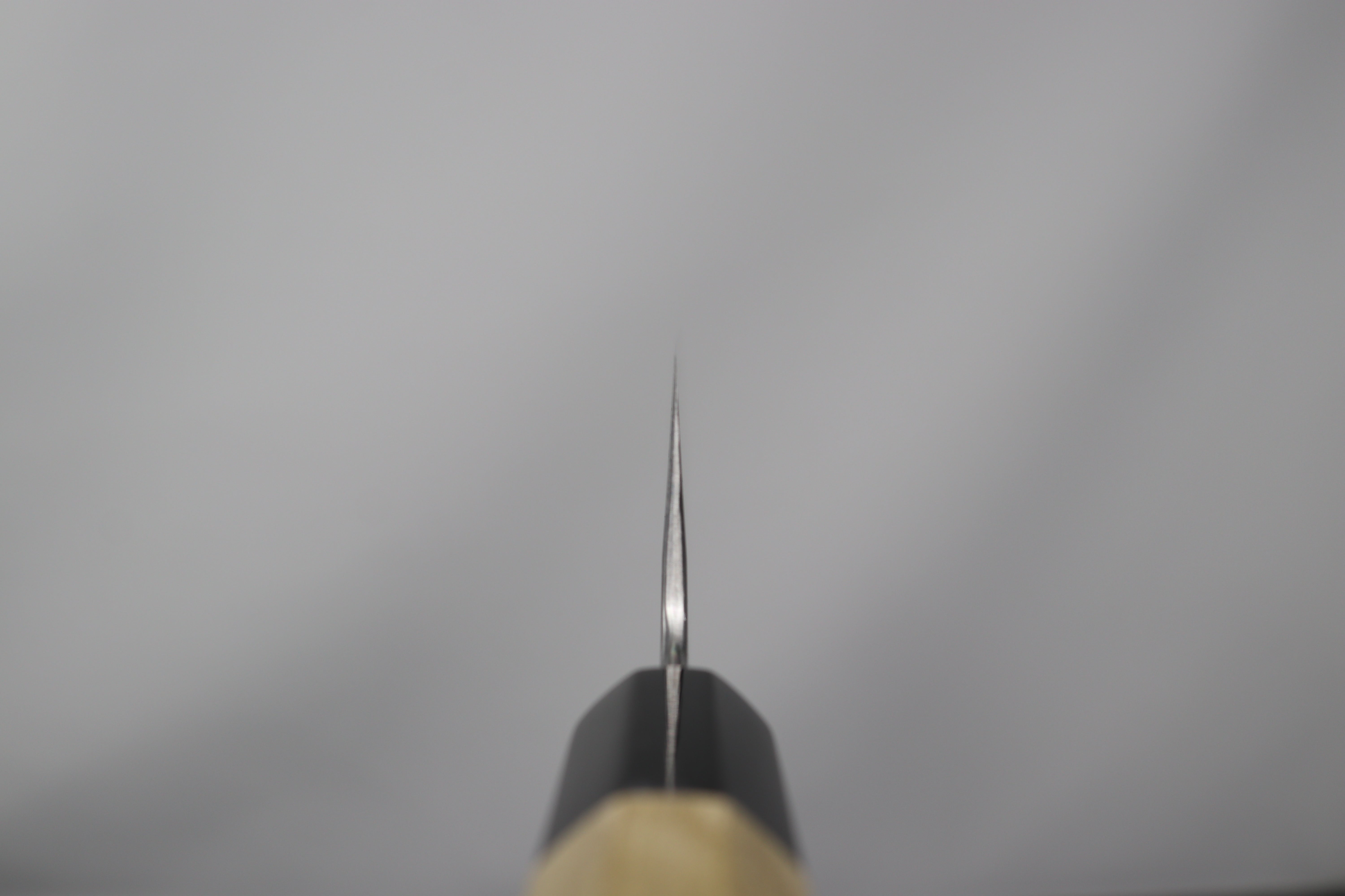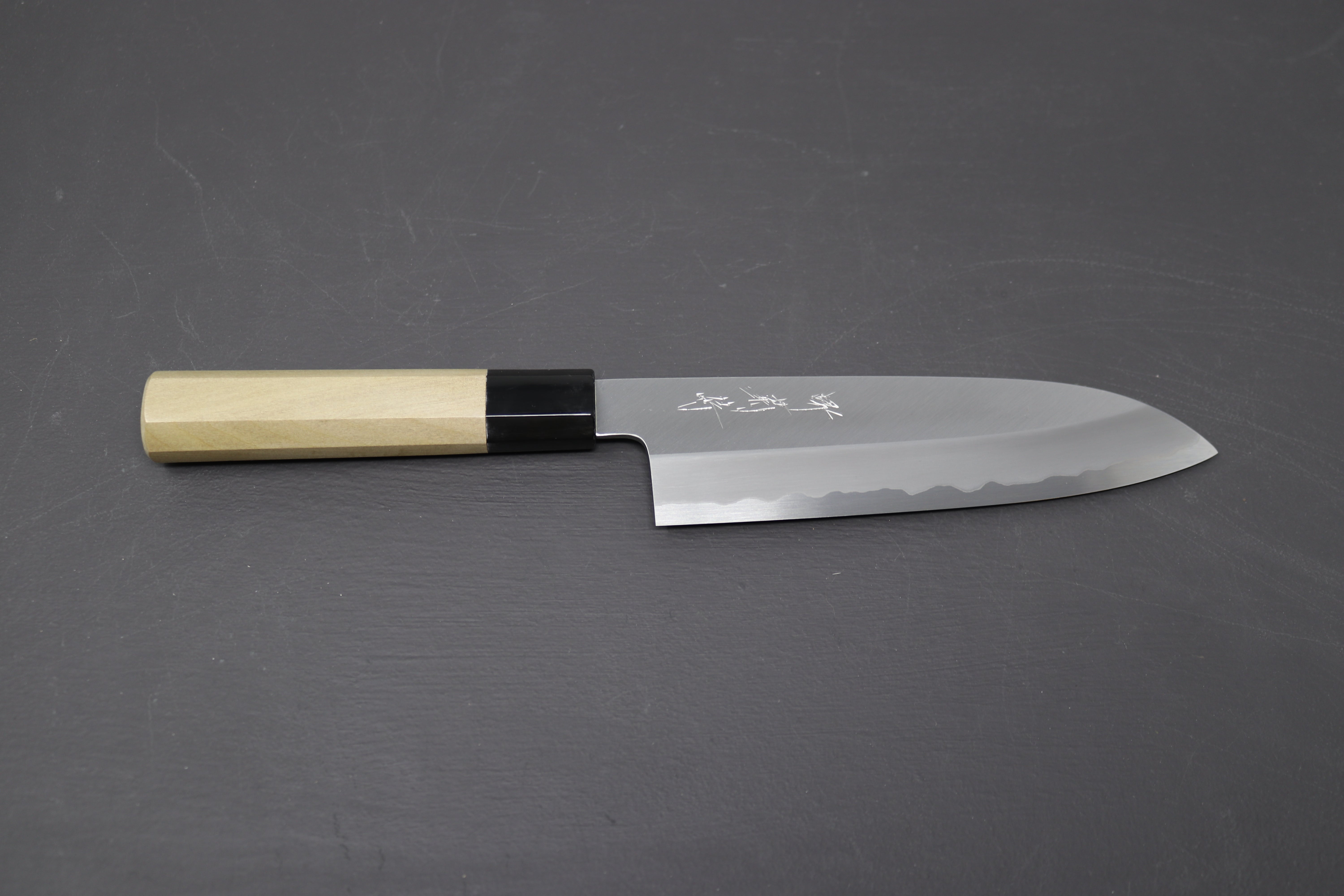 Santoku: A well-rounded knife that can accomplish a lot of cutting tasks. The santoku is the most common knife shape you’ll find in kitchens worldwide and it excels at slicing, dicing, and mincing. Think of it as a cross between a Gyuto (chef knife) and Nakiri (veg knife). Generally short in length, 160mm-190mm, the santoku is a superb knife if work space is an issue.