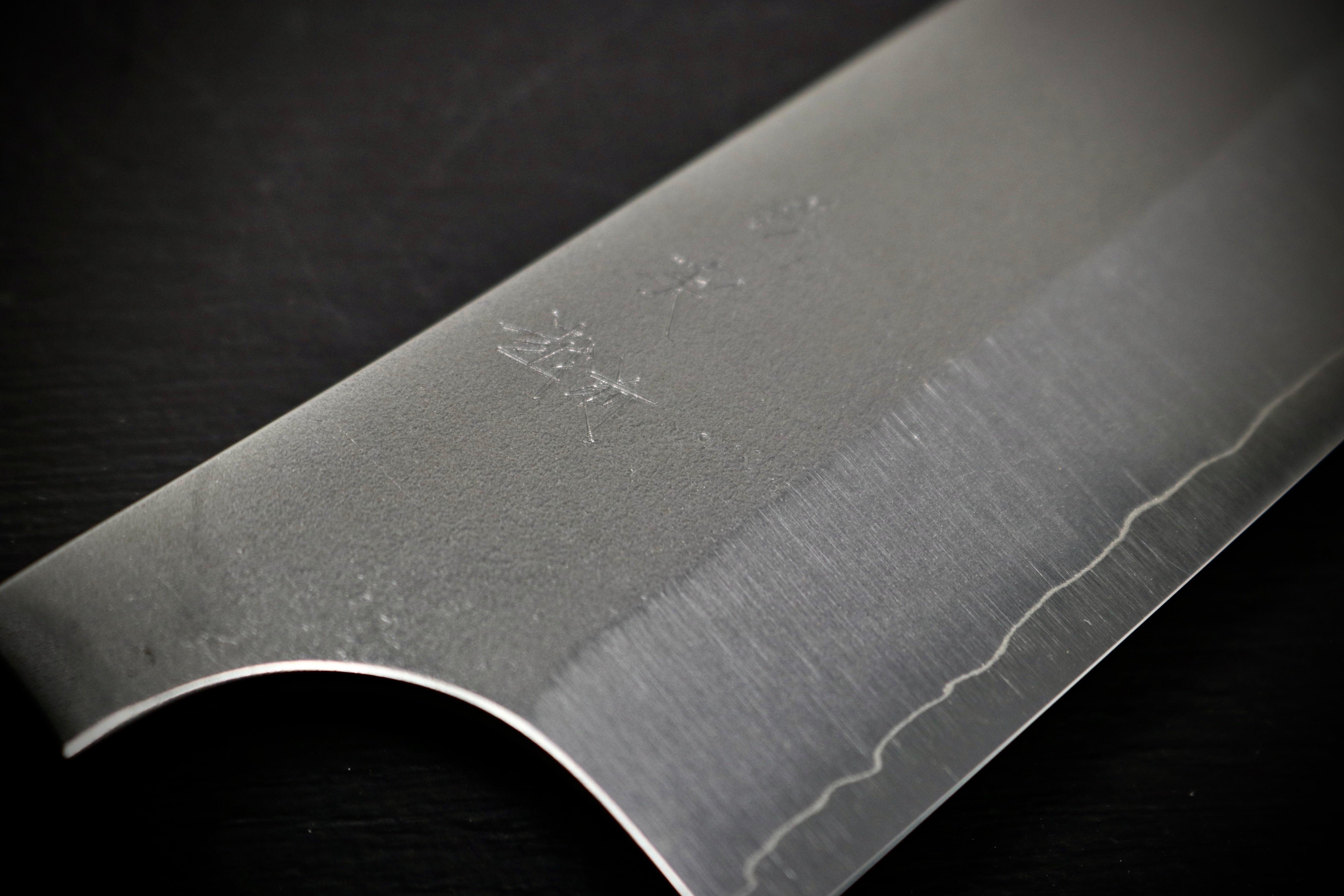 Gyuto: A general-purpose knife that most chefs would say they could not do without. This knife is the Japanese knife makers answer to the western “chef knife”. Gyuto translates to “cow blade”. They are generally tall at the heel, flat throughout, and rounded toward the tip of the knife for rock chopping. I use my gyuto for just about anything, from butchering fish, to brunoise veg, to cutting the cake. Any good chef will tell you to buy a quality Gyuto first, and build the the rest of your knife kit around it.