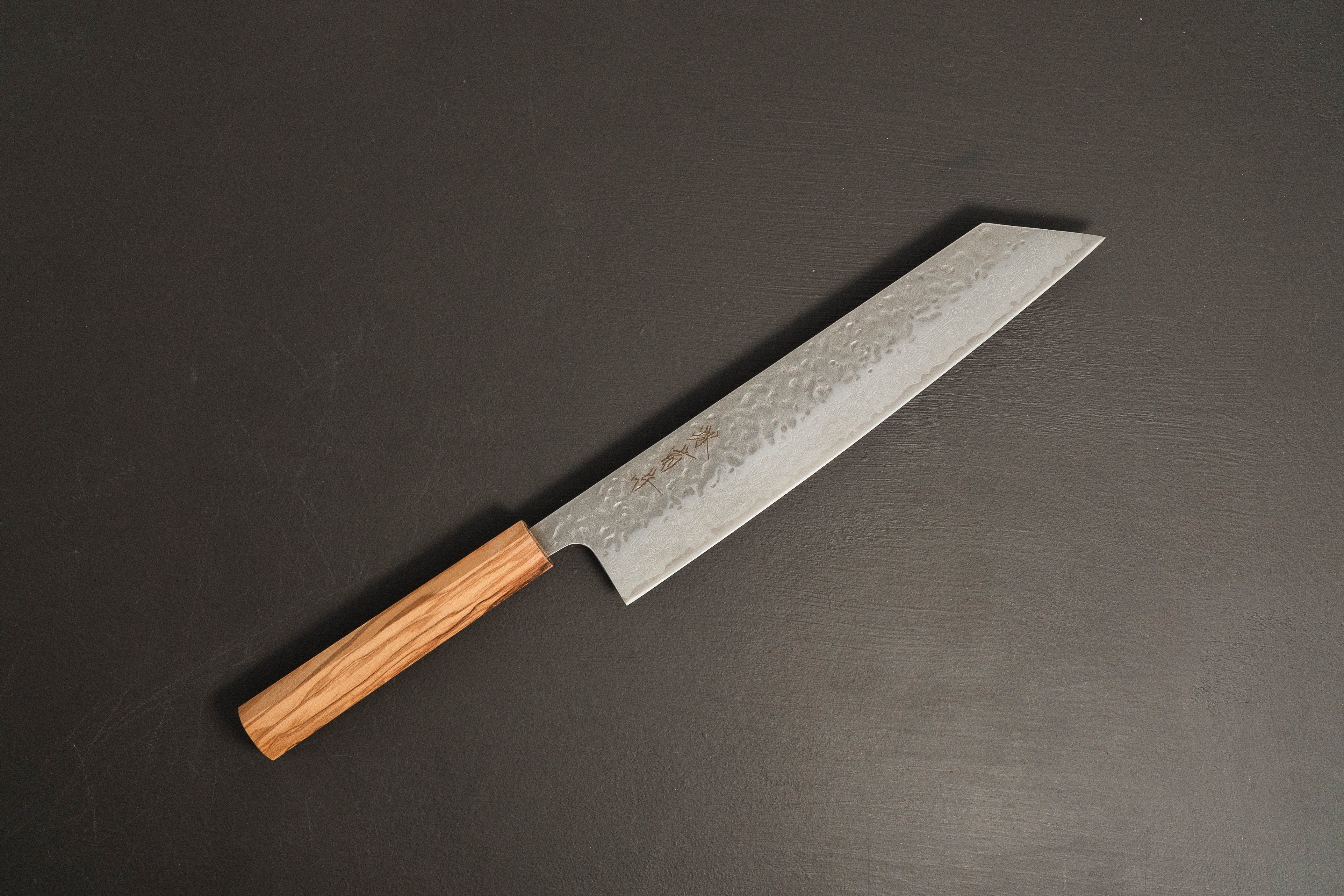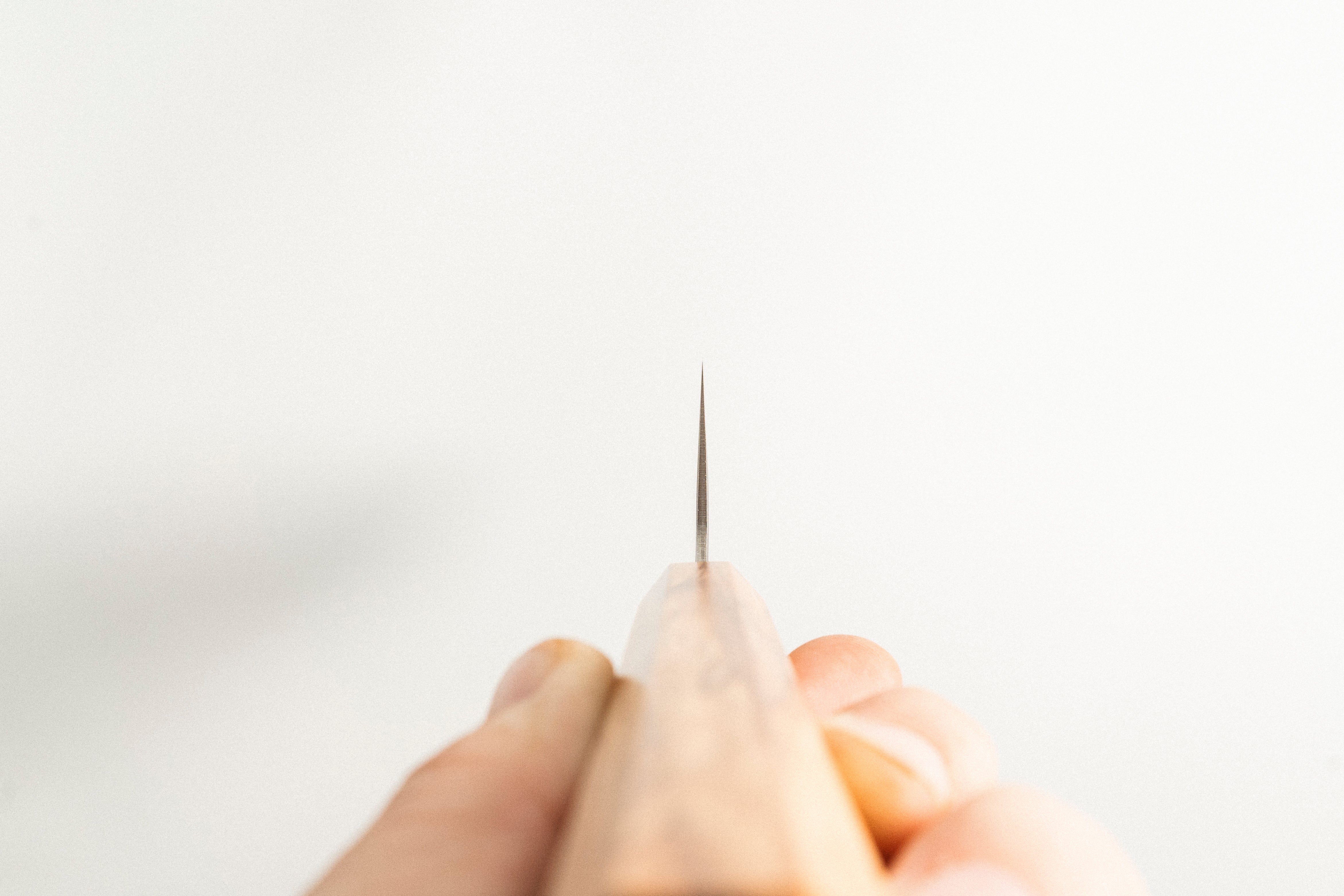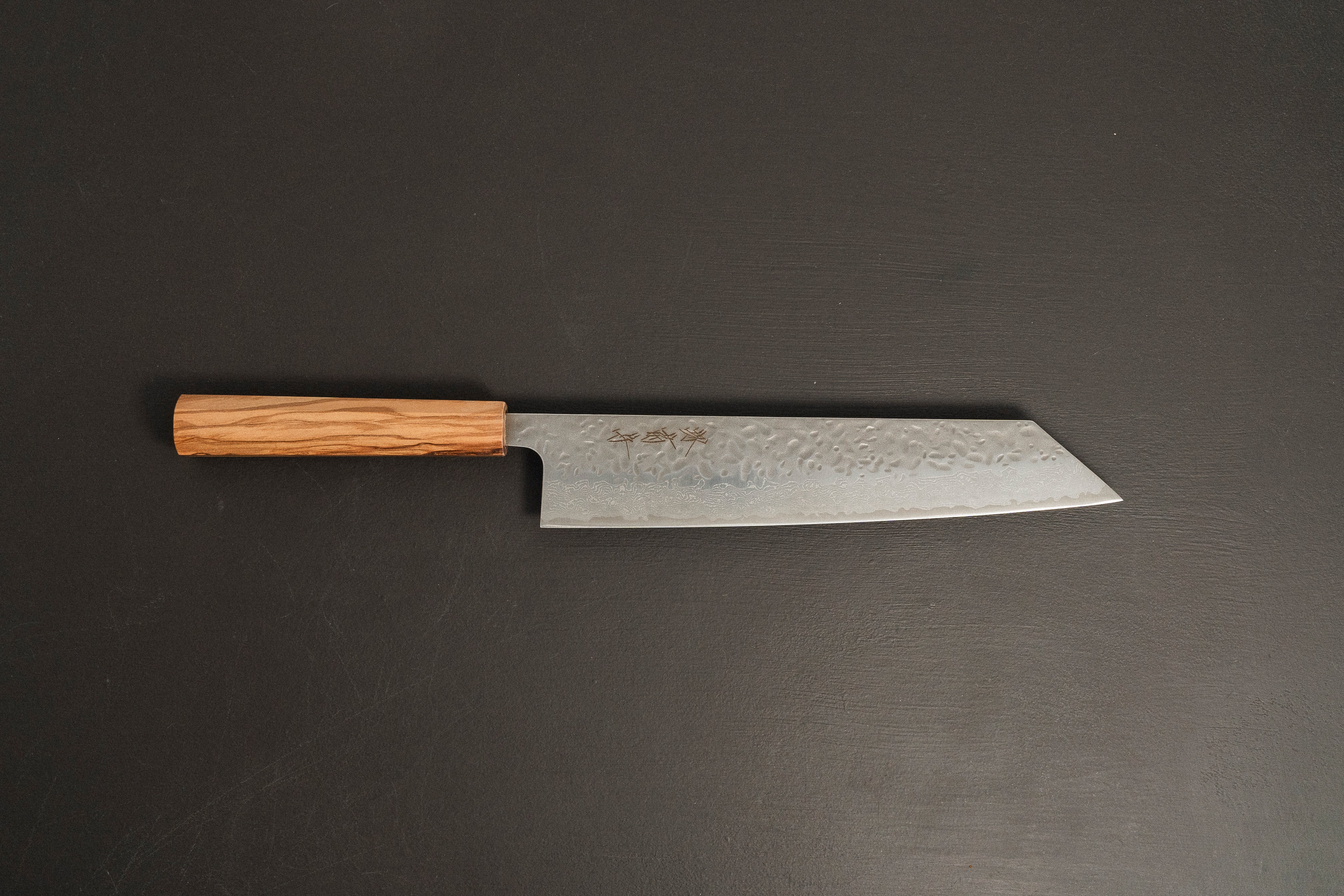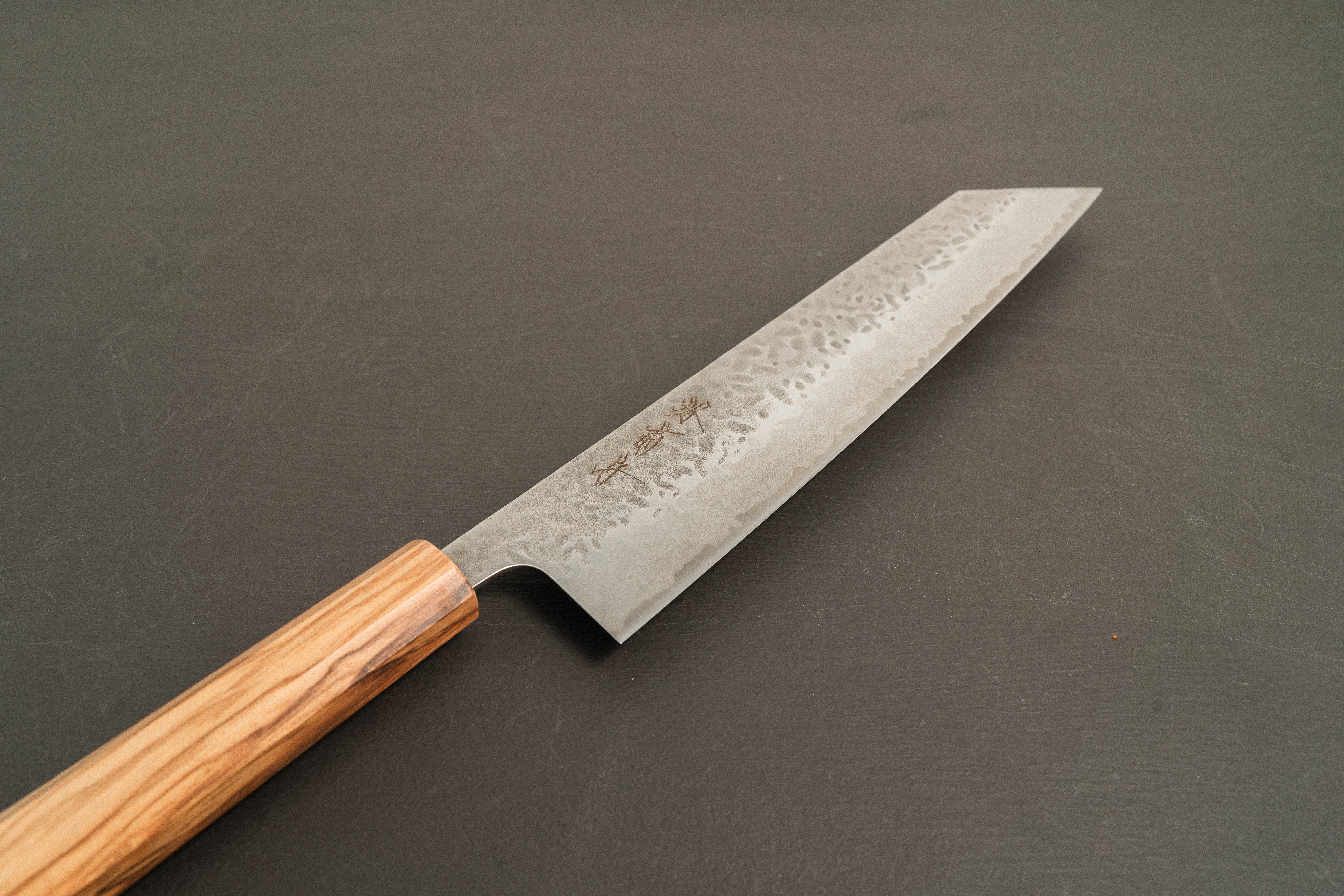 Gyuto: A general-purpose knife that most chefs would say they could not do without. This knife is the Japanese knife makers answer to the western “chef knife”. Gyuto translates to “cow blade”. They are generally tall at the heel, flat throughout, and rounded toward the tip of the knife for rock chopping. I use my gyuto for just about anything, from butchering fish, to brunoise veg, to cutting the cake. Any good chef will tell you to buy a quality Gyuto first, and build the the rest of your knife kit around it.