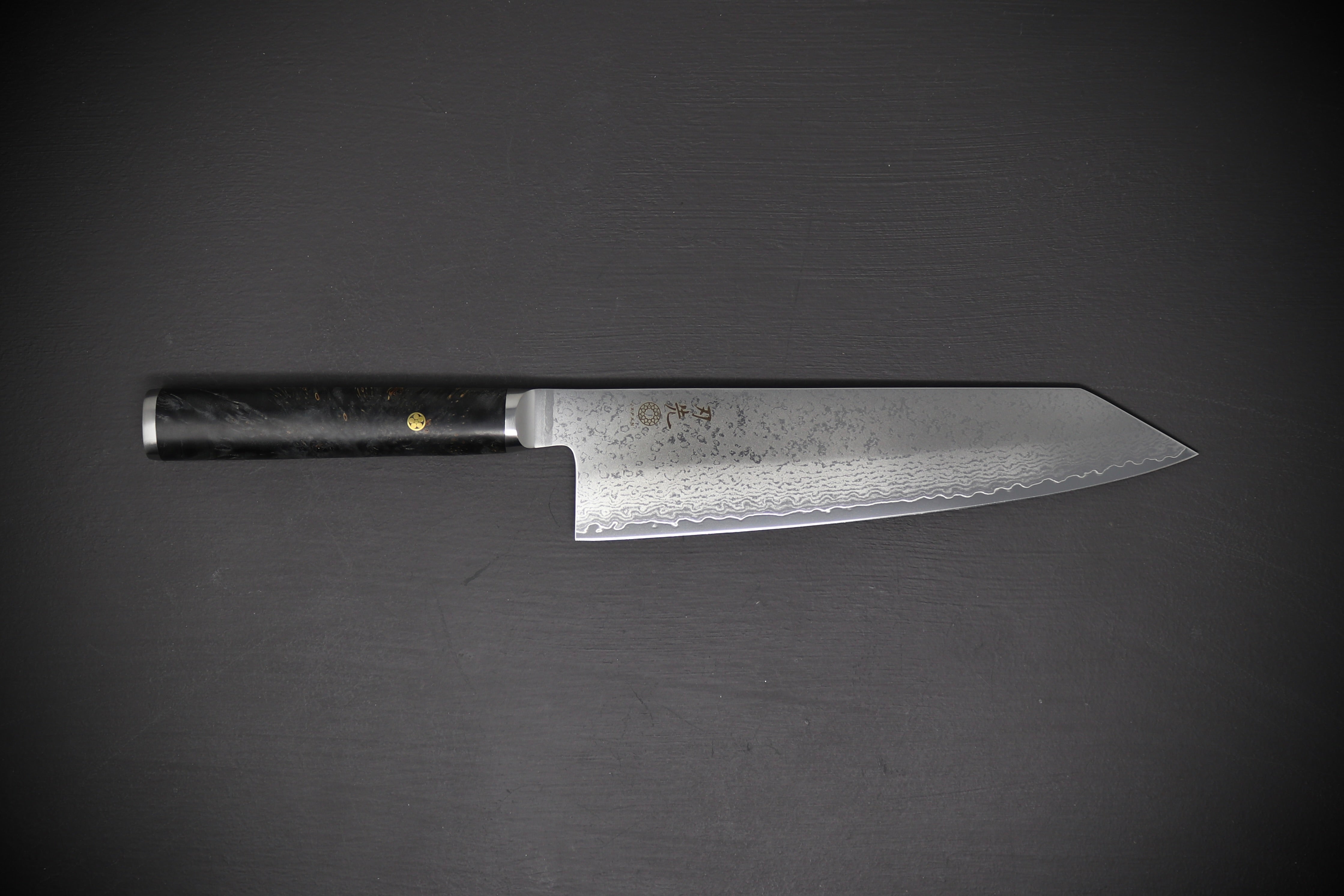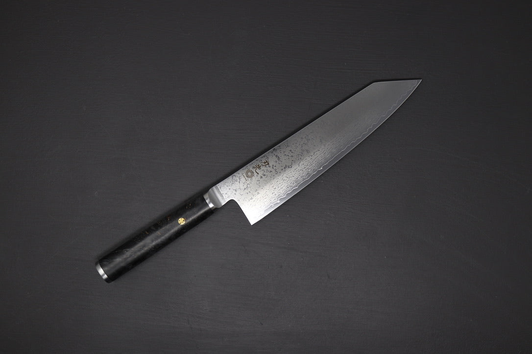 Gyuto: A general-purpose knife that most chefs would say they could not do without. This knife is the Japanese knife makers answer to the western chef knife. Gyuto translates to cow blade. They are generally tall at the heel, flat throughout, and rounded toward the tip of the knife for rock chopping. We use our gyuto for just about anything, from butchering certain fish, to brunoise veg, to cutting the cake. Any good chef will tell you to buy a quality Gyuto first, and build the the rest of your knife kit around it.