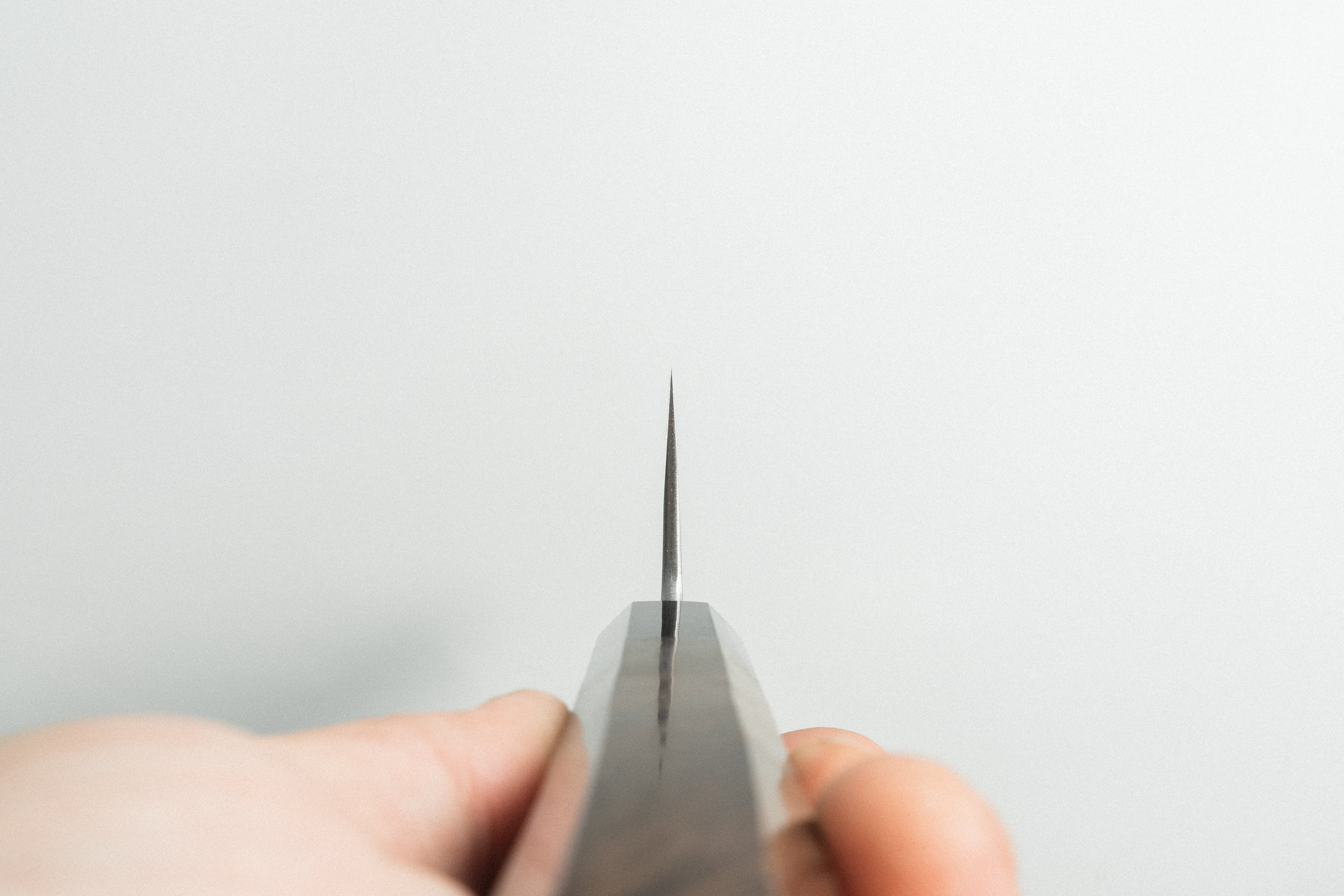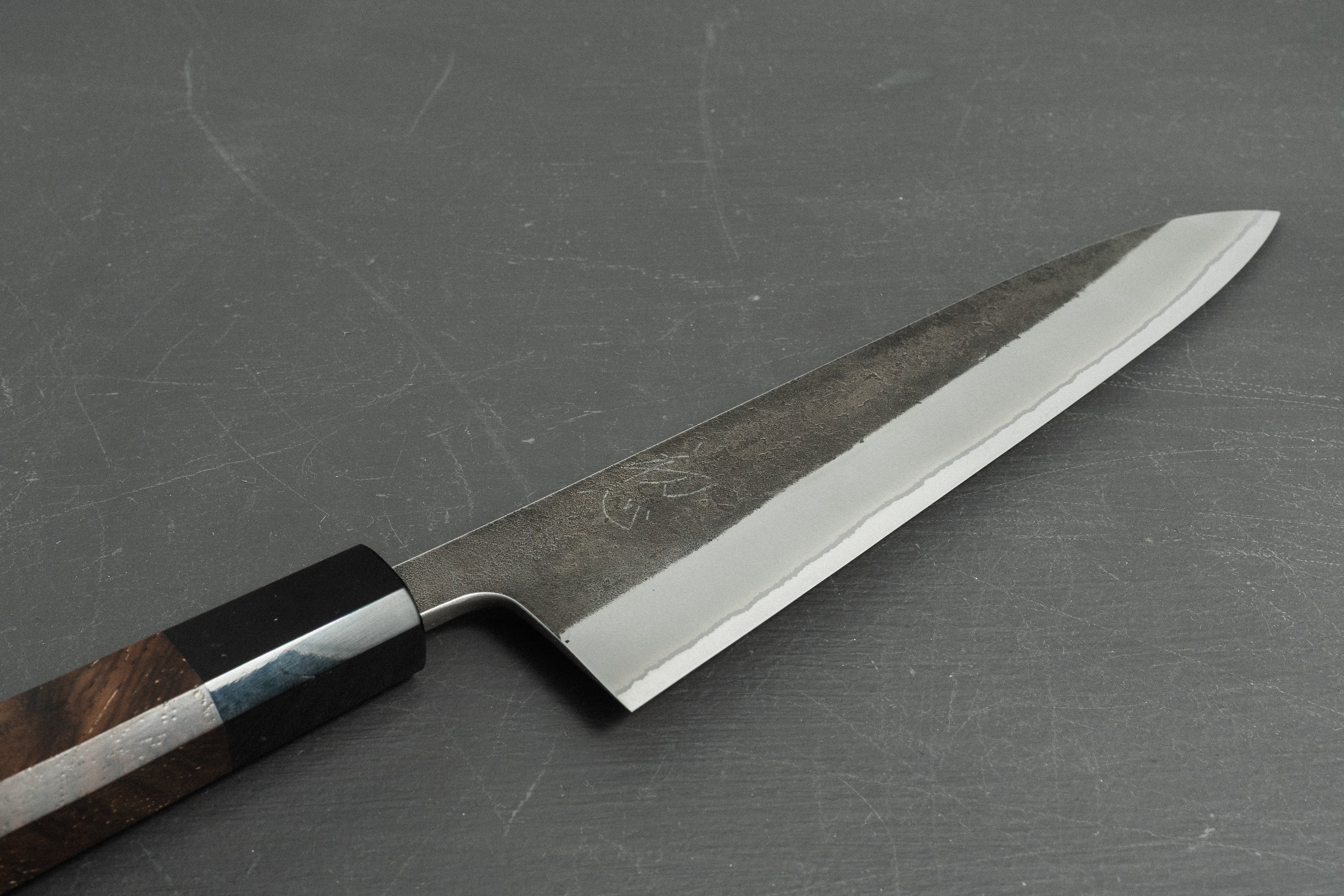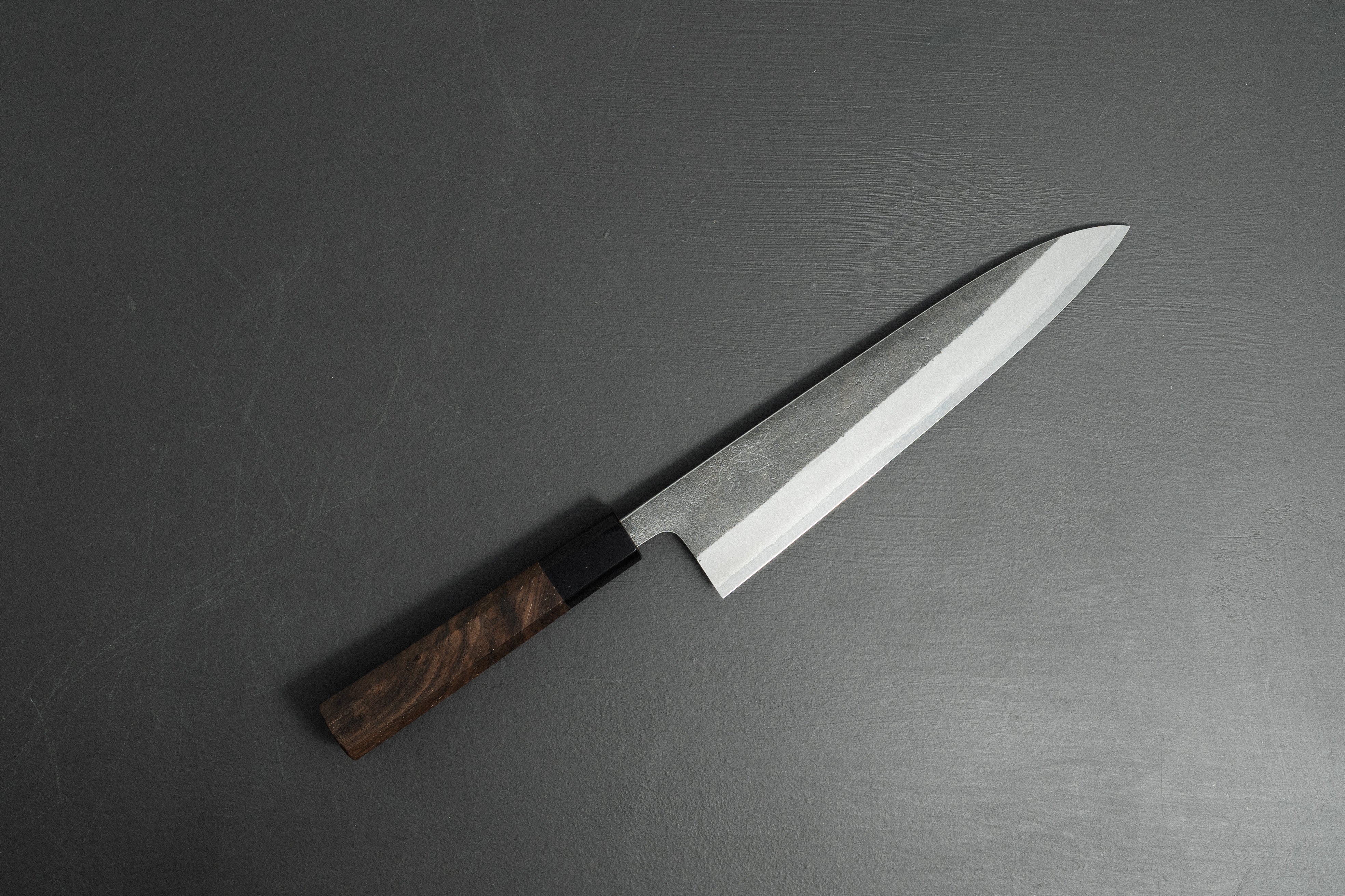 Gyuto: A general-purpose knife that most chefs would say they could not do without. This knife is the Japanese knife makers answer to the western “chef knife”. Gyuto translates to “cow blade”. They are generally tall at the heel, flat throughout, and rounded toward the tip of the knife for rock chopping. I use my gyuto for just about anything, from butchering certain fish, to brunoise veg, to cutting the cake. Any good chef will tell you to buy a quality Gyuto first, and build the the rest of your knife kit around it.