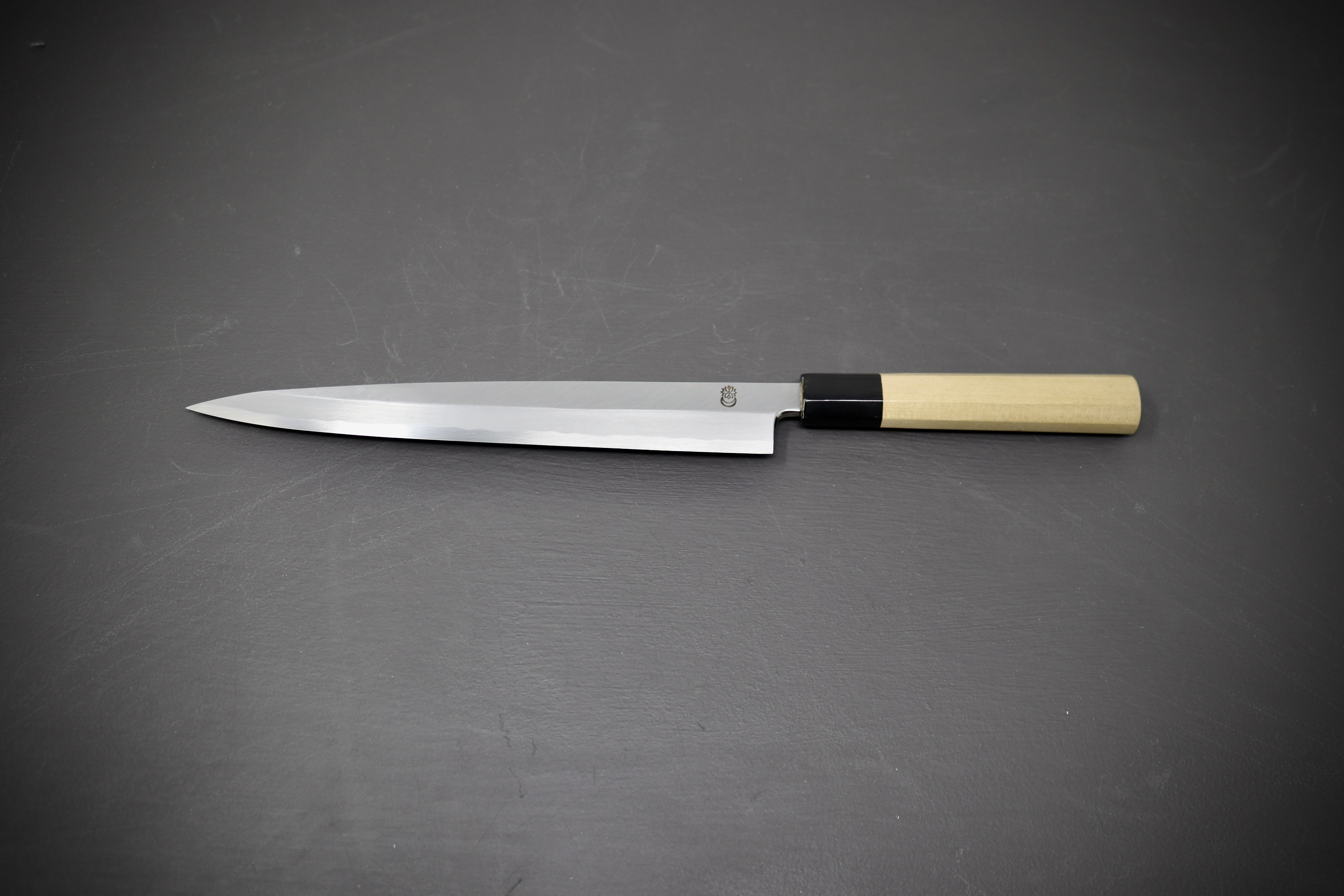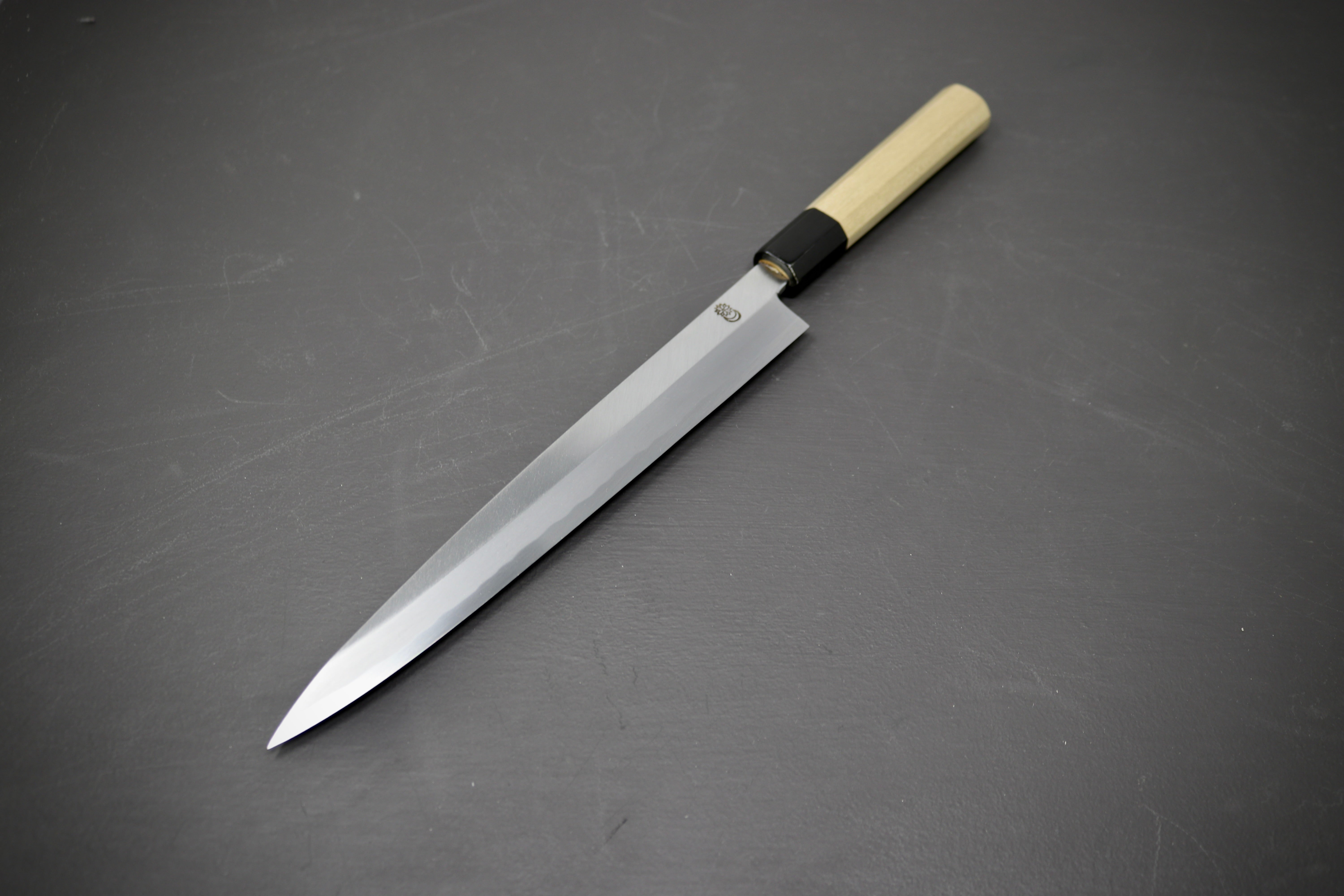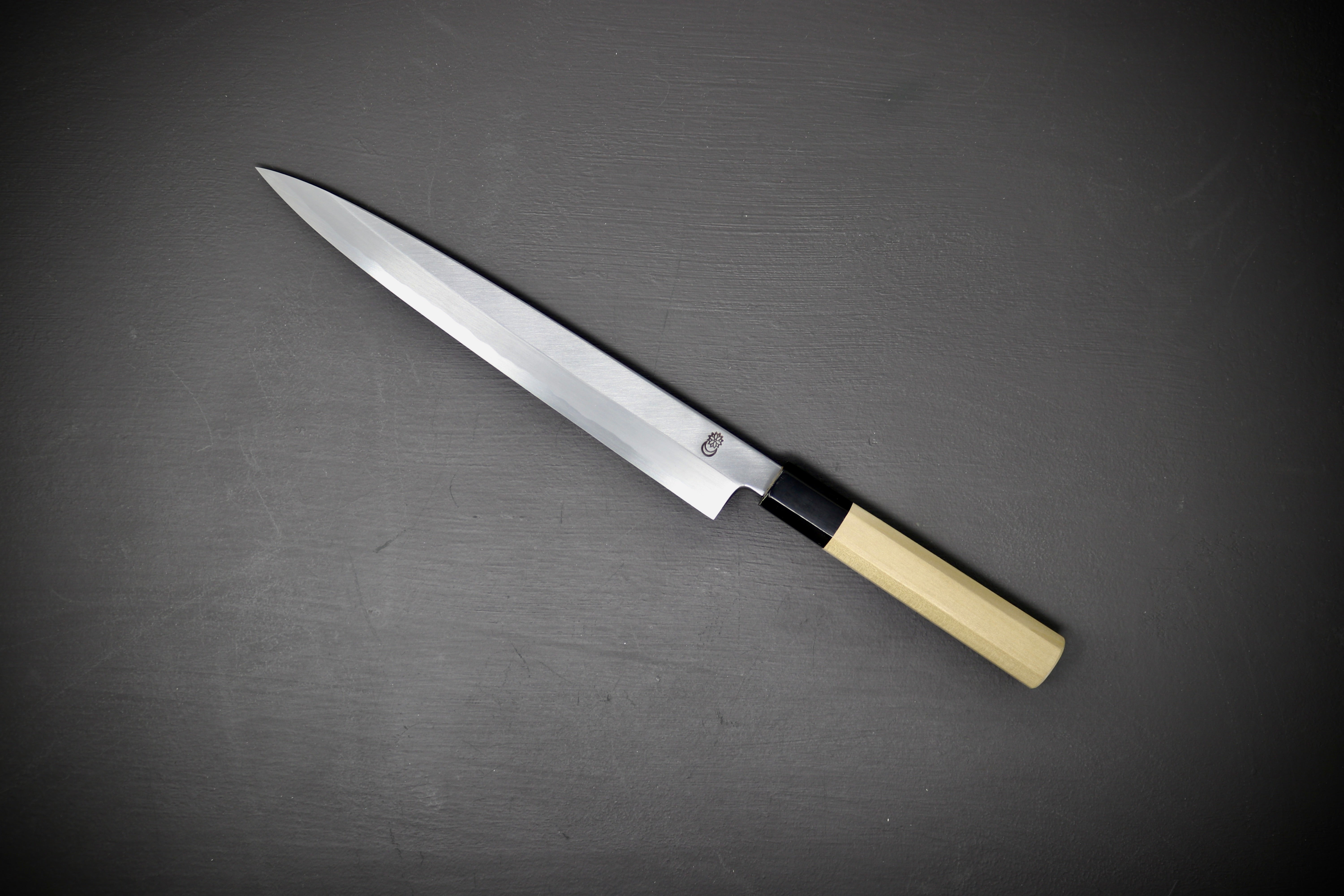 Yanagiba (Willow Leaf): A single bevel knife used for slicing raw fish. Generally very thin at the edge for precision knife work, it is designed for the pull cutting technique used by sushi chefs. The single bevel design allows the knife to glide through the knife disturbing as little protein molecules as possible. This all results in shiny slices of food, perfect for raw presentation.