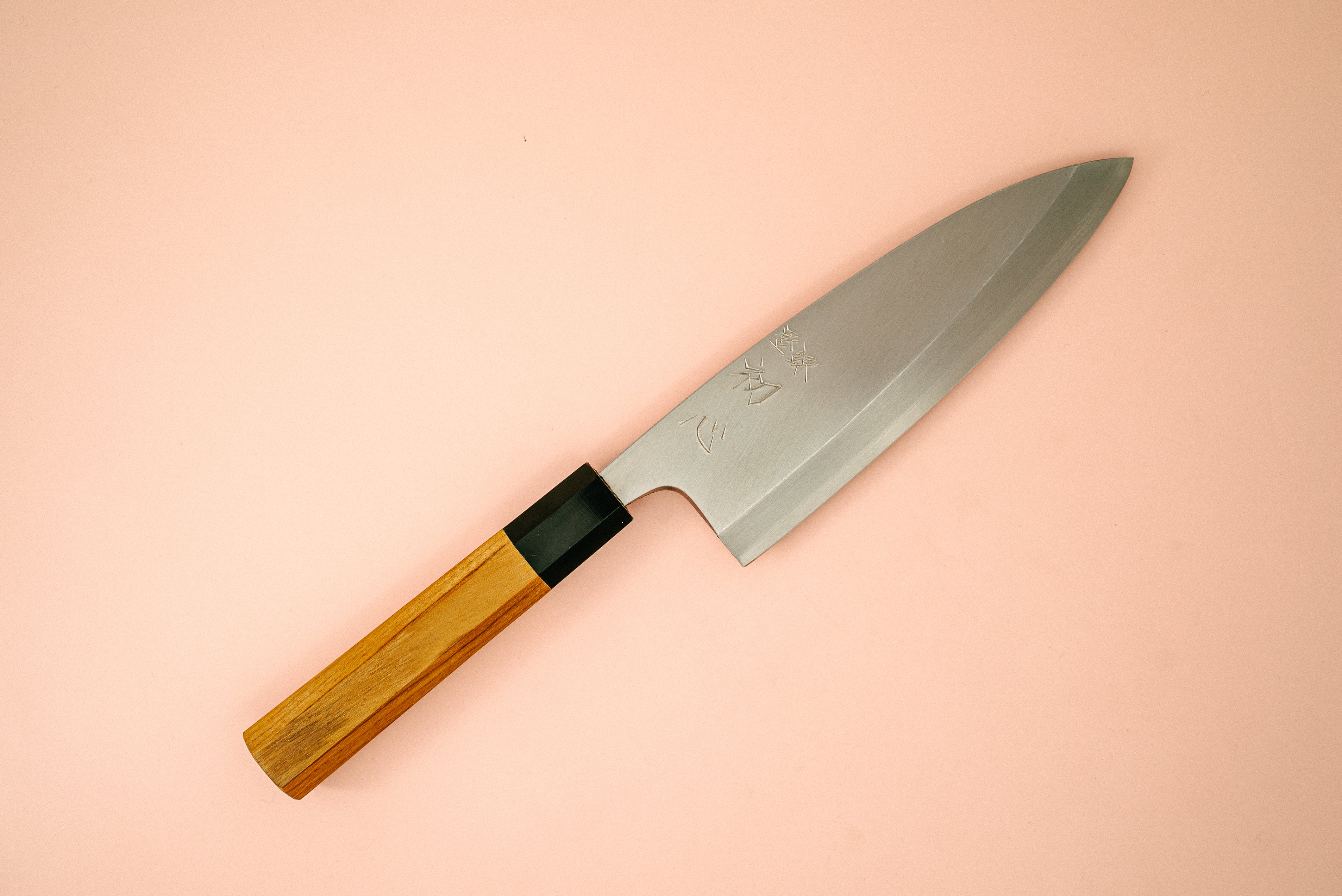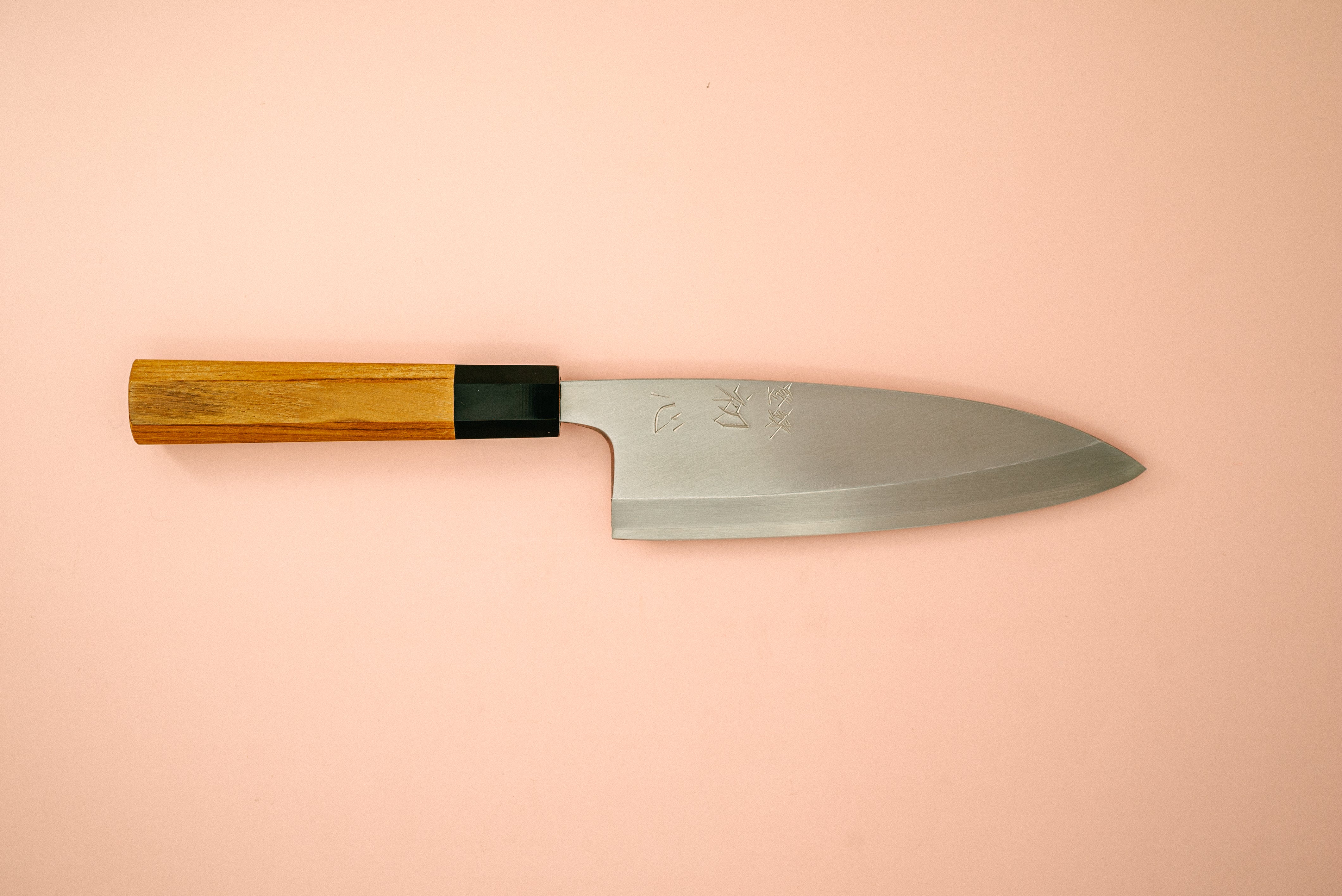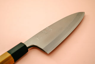 Deba: This would be the first knife a sushi chef would reach for at the start of each day. Traditionally the deba is a single bevel knife designed specifically for fish butchery. The single bevel design allows the knife to get super sharp, and lends itself perfectly to the overall breakdown of fish. The hefty weight allows the user to navigate easily through fish skin and certain bones.