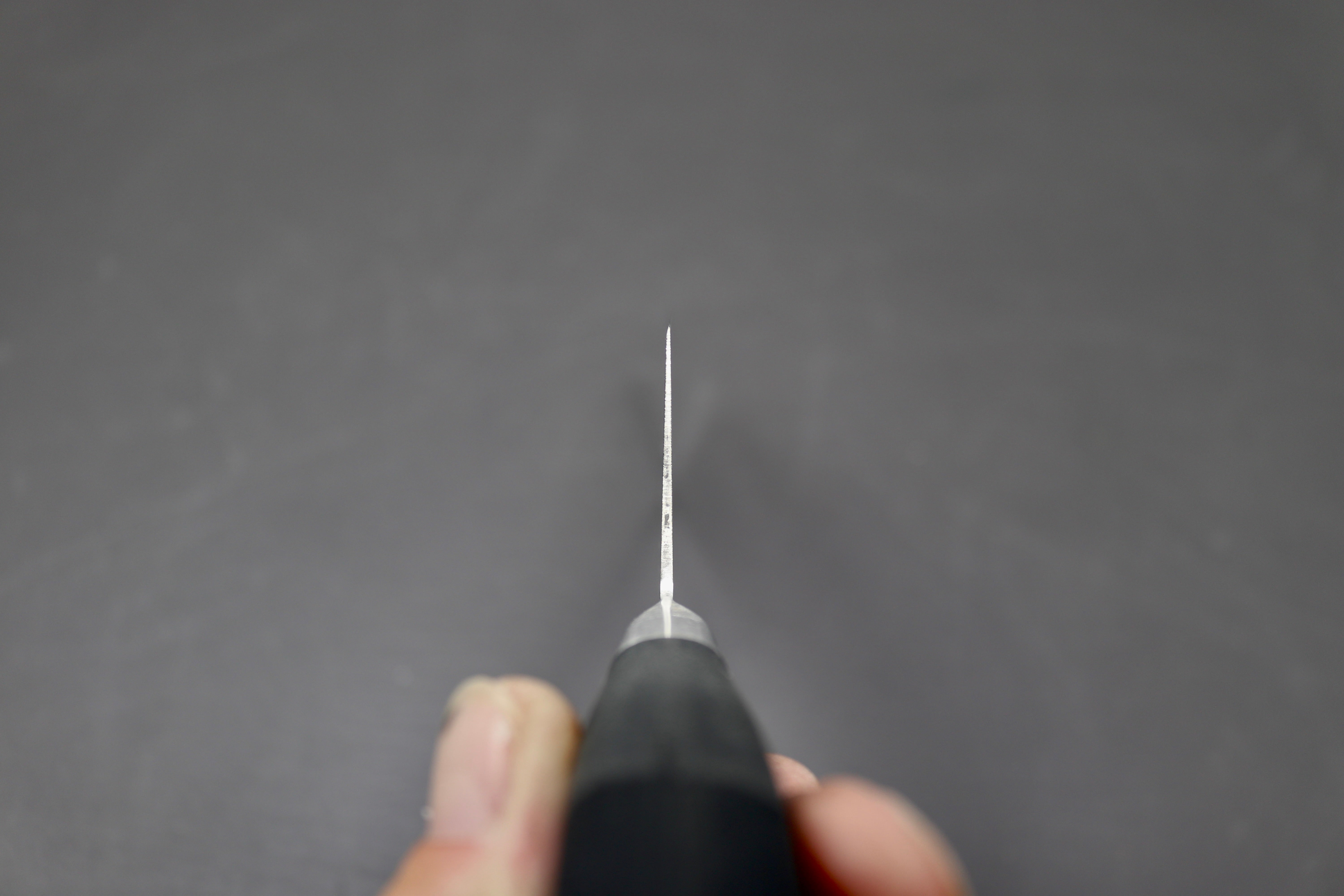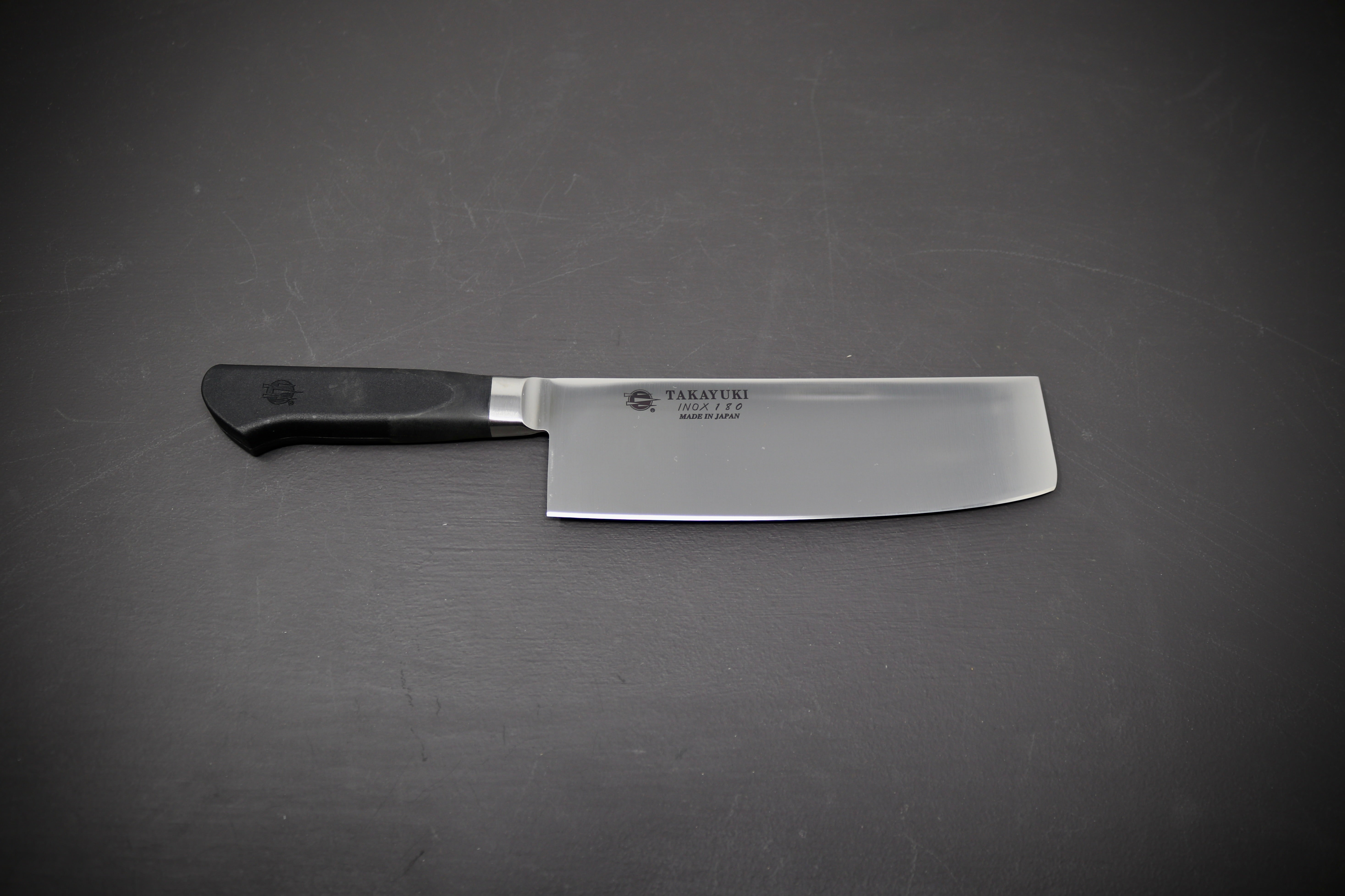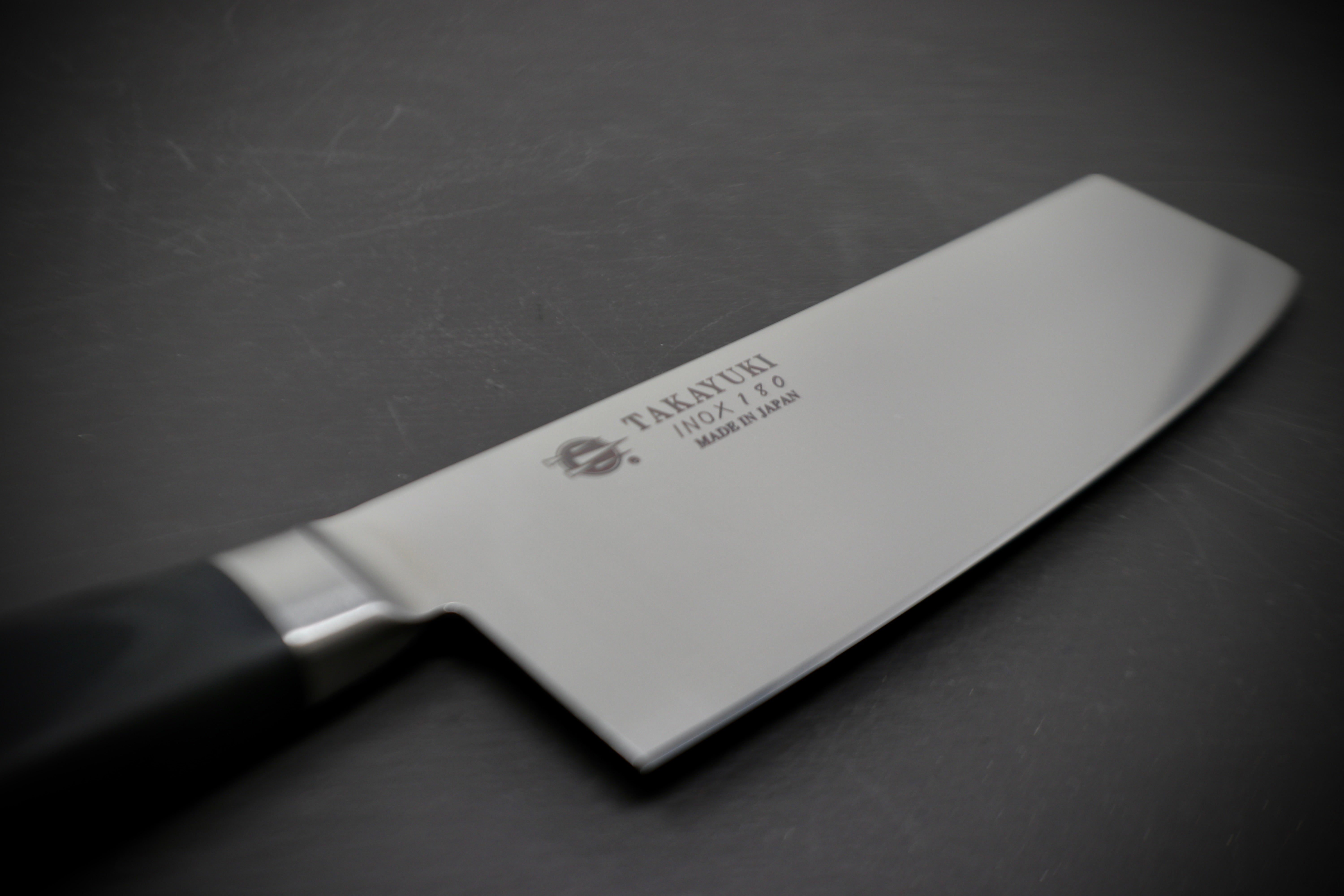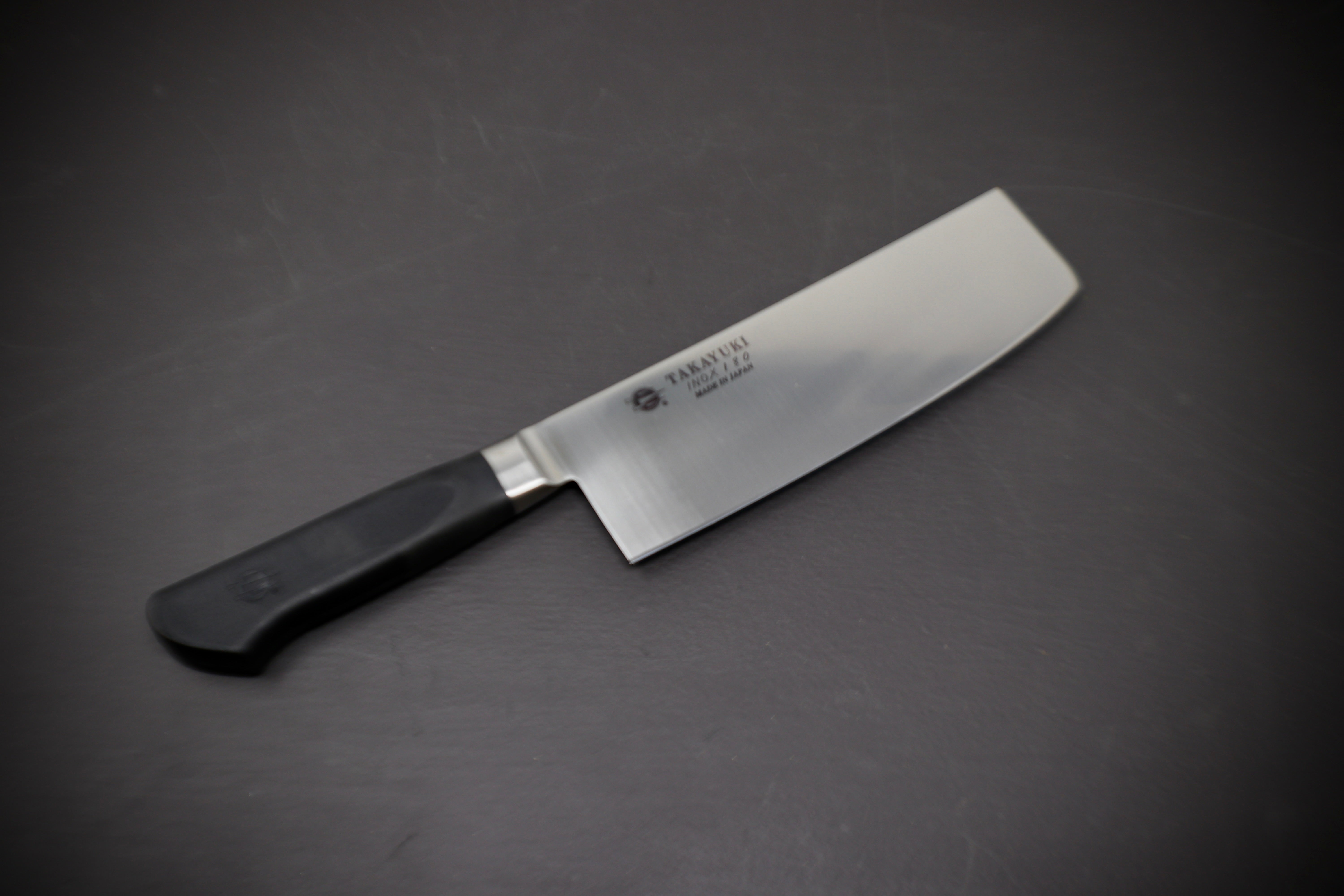 Nakiri: A double bevel knife designed specifically for taking care of vegetable prep. Nakiri’s are quite recognizable by their flat profile and squared off nose, which aid in the push/pull chopping style. Generally these knives are ground quite thin for refined chopping.