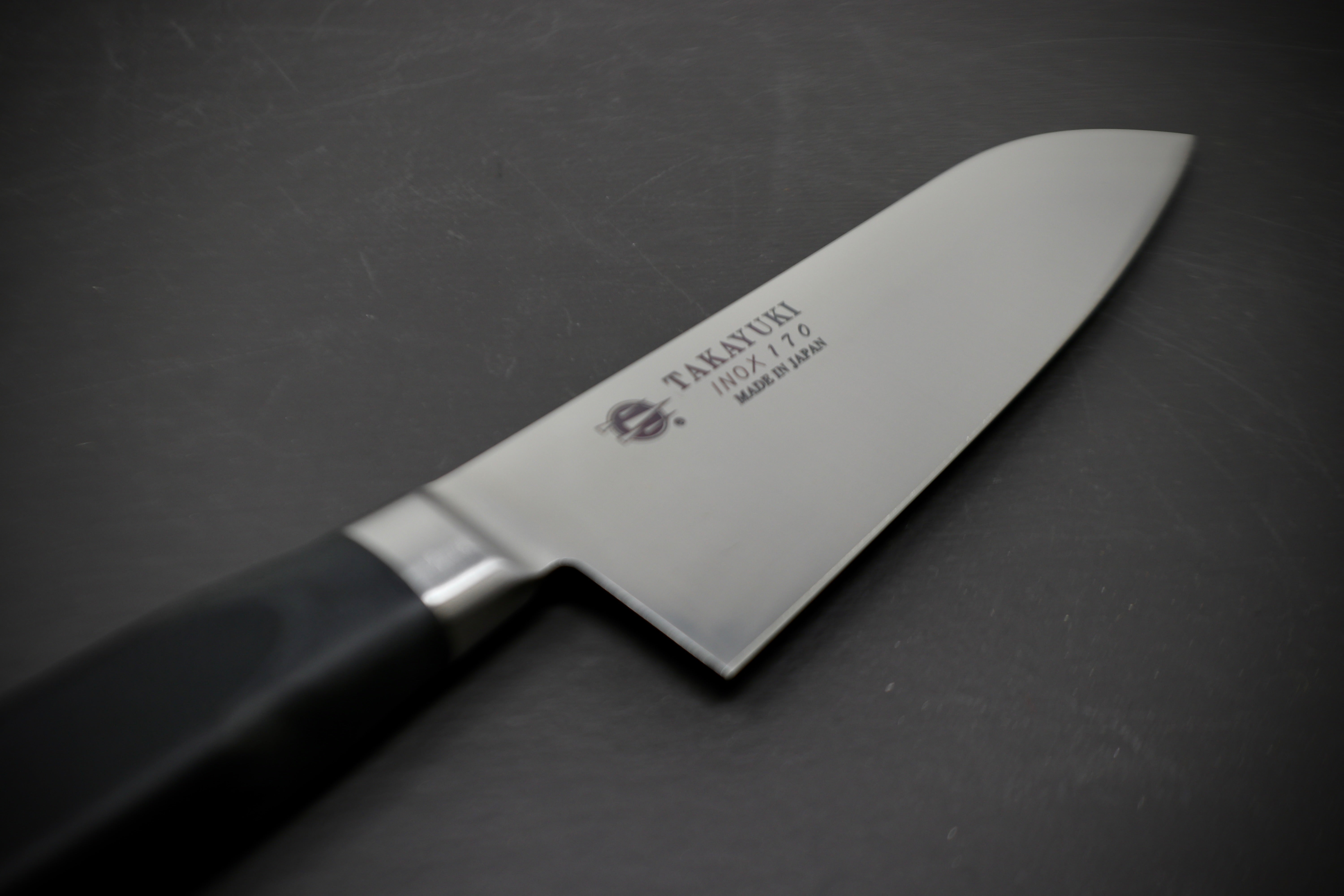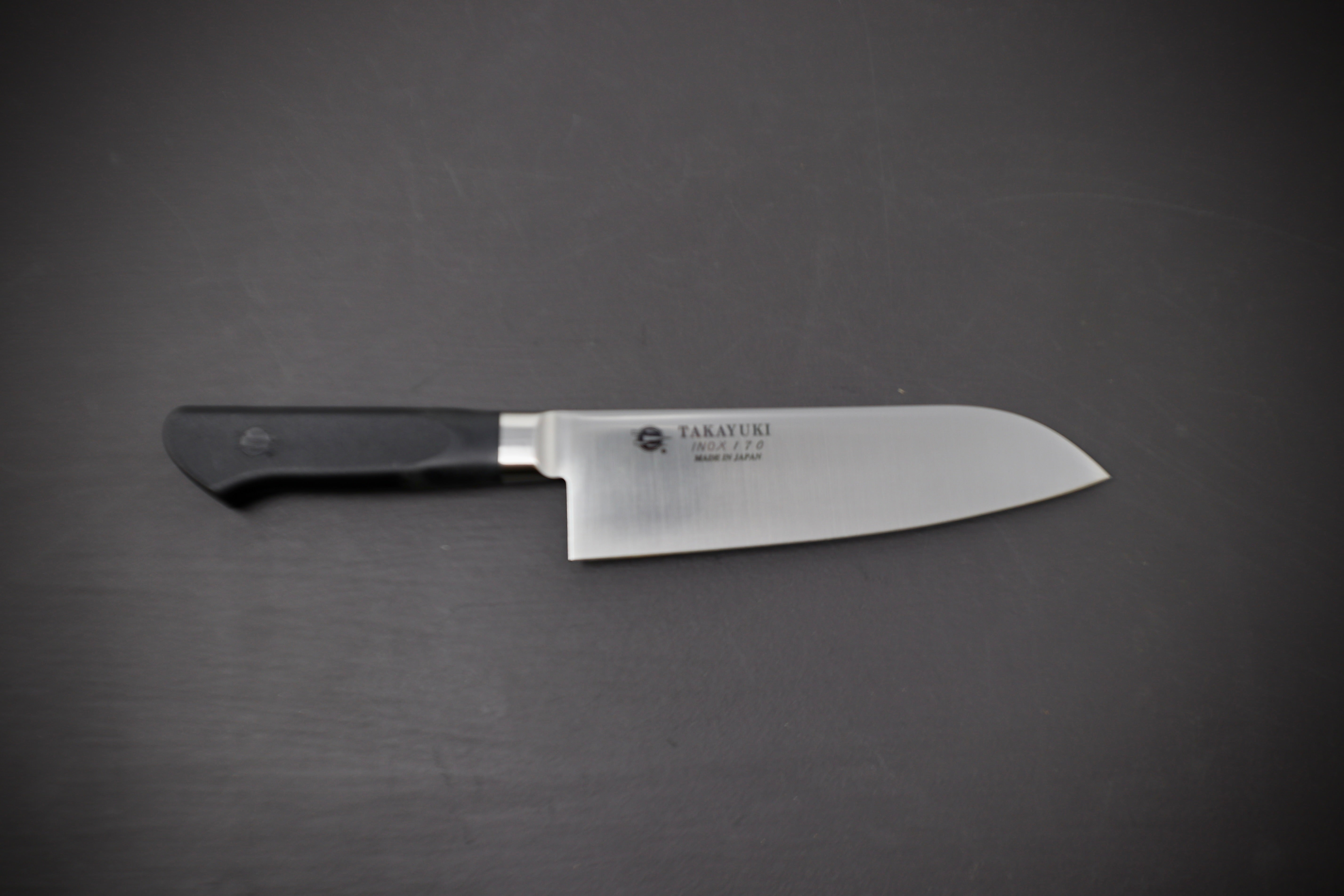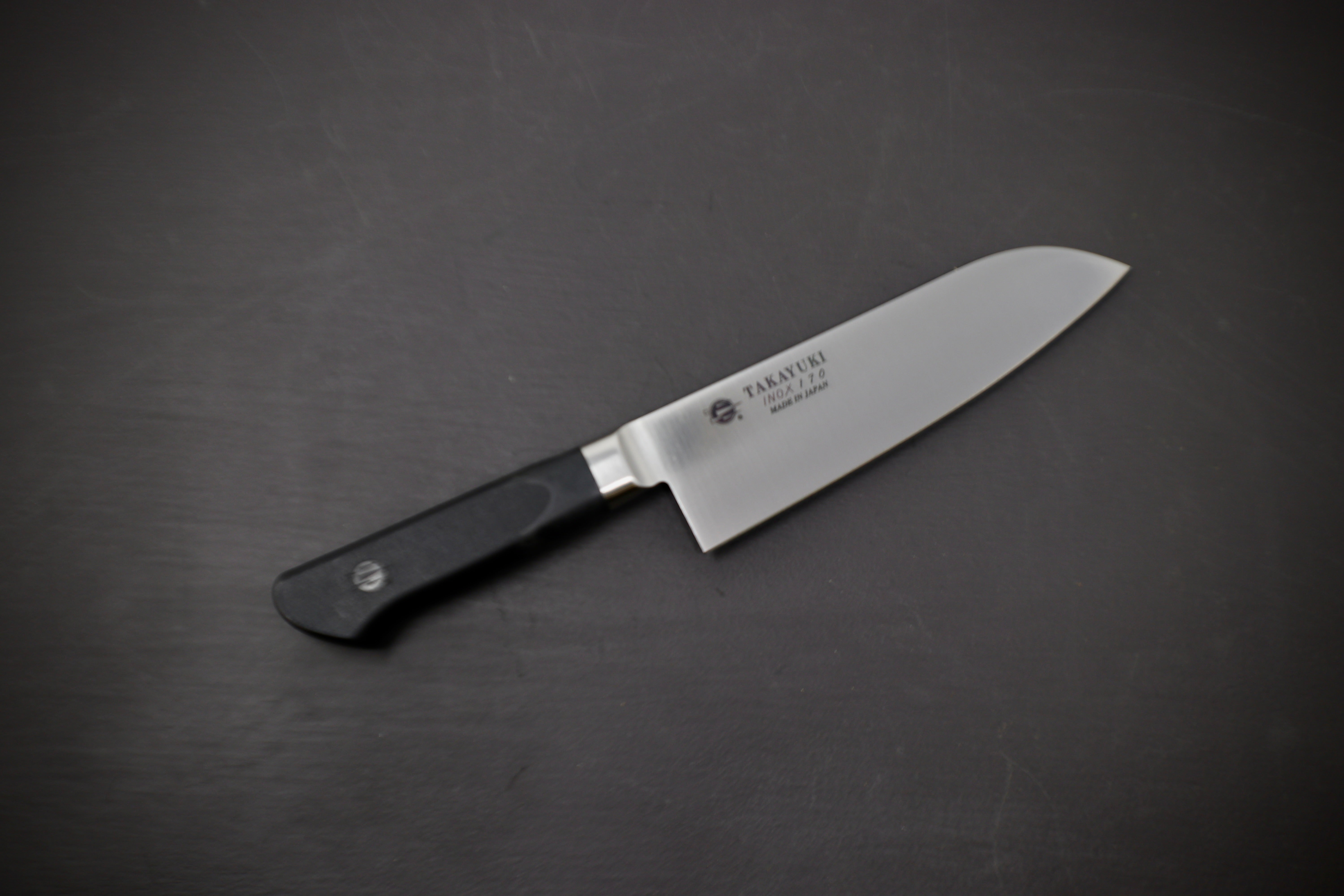 Santoku: A well-rounded knife that can accomplish a lot of cutting tasks. The santoku is the most common knife shape you’ll find in kitchens worldwide and it excels at slicing, dicing, and mincing. Think of it as a cross between a Gyuto (chef knife) and Nakiri (veg knife). Generally short in length, 160mm-190mm, the santoku is a superb knife if work space is an issue.